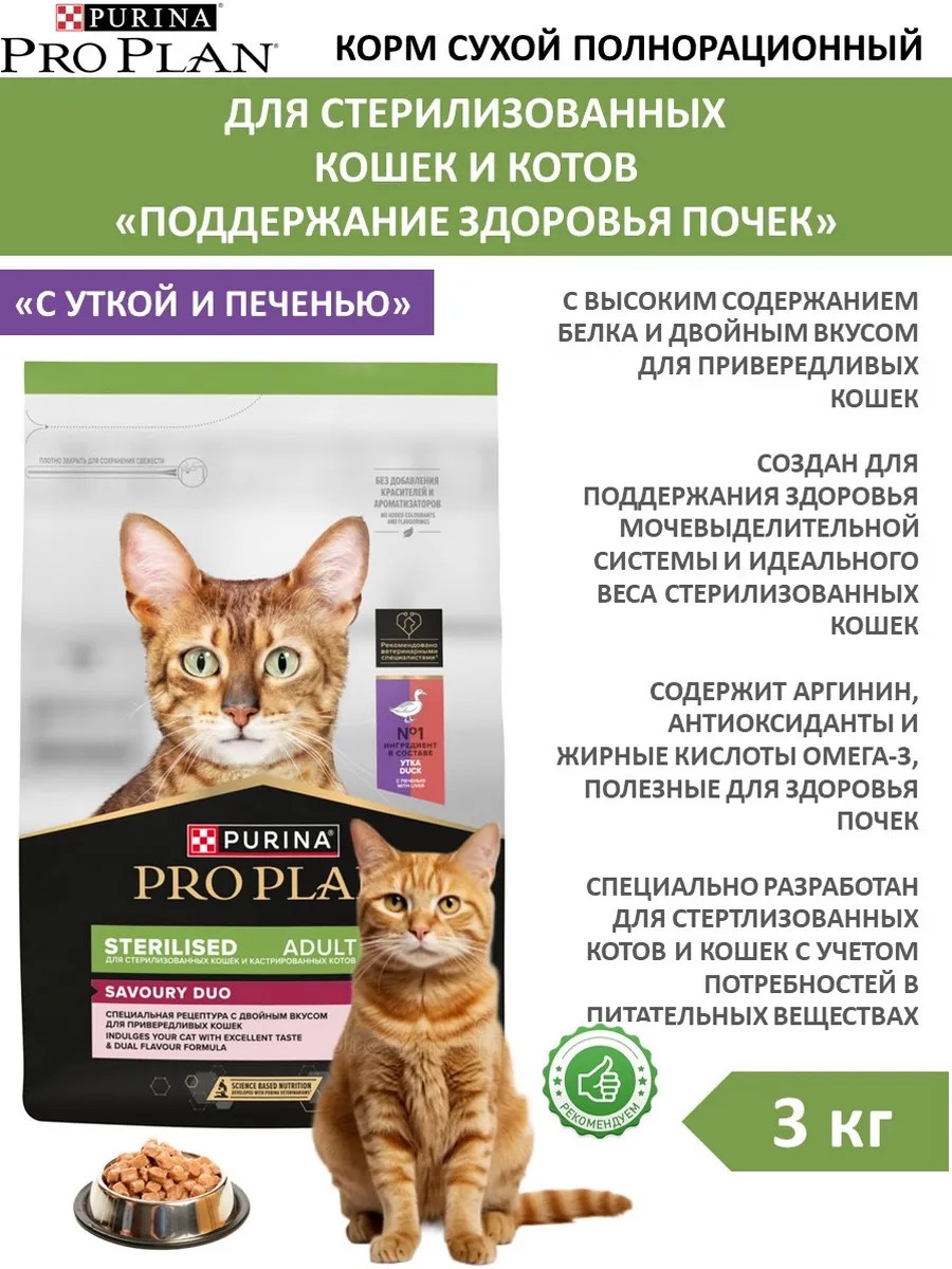 | Полное наименование товара | Сухой корм PRO PLAN Sterilised SAVOURY DUO с двойным вкусом для взрослых стерилизованных привередливых кошек, с уткой и с печенью, 3 кг |