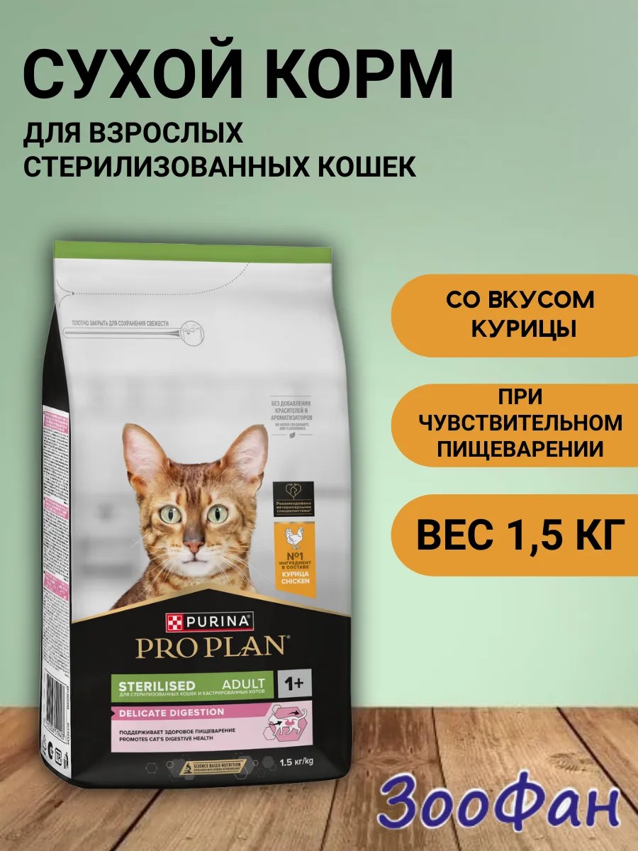 Сухой корм ПРО ПЛАН для взрослых кошек для стерилизованных и кастрированных котов с чувствительным пищеварением с курицей 1.5кг