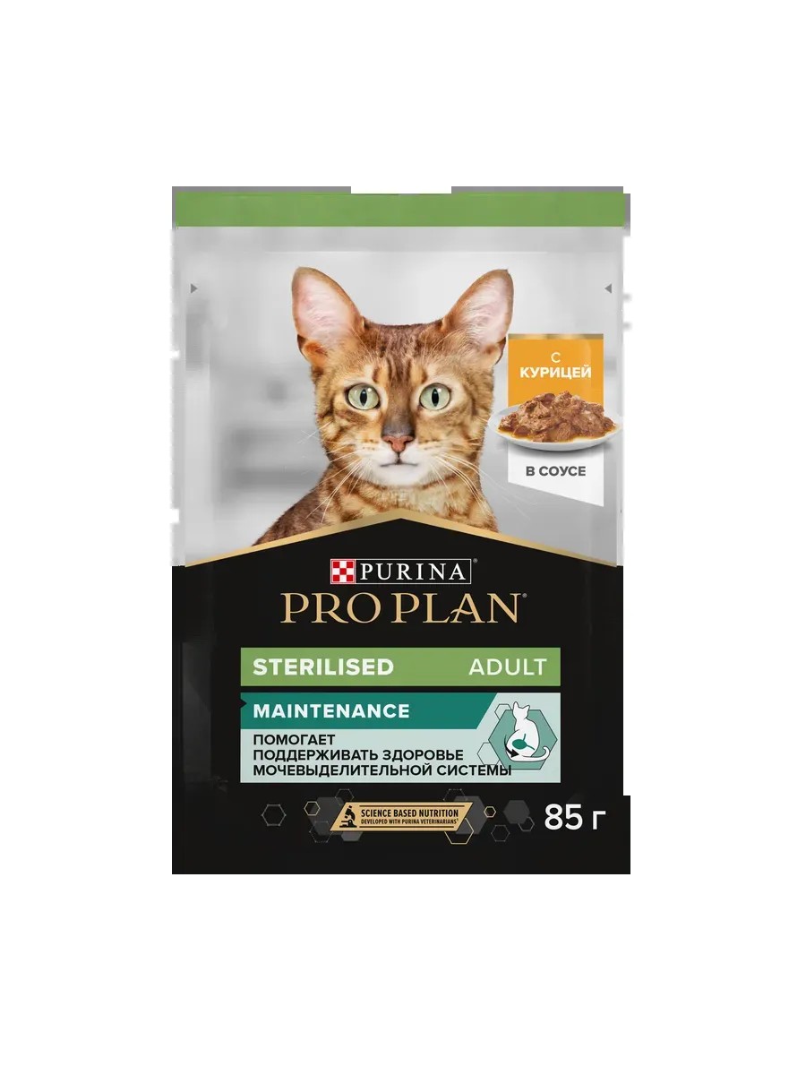Влажный корм PRO PLAN Sterilised MAINTENANCE для взрослых стерилизованных кошек, с курицей в соусе, 85 г x 26 шт. Этот полнорационный корм для кошек с курицей разработан с учетом их потребностей в высококачественном белке, а также витаминах и минералах, необходимых для нормального функционирования организма.