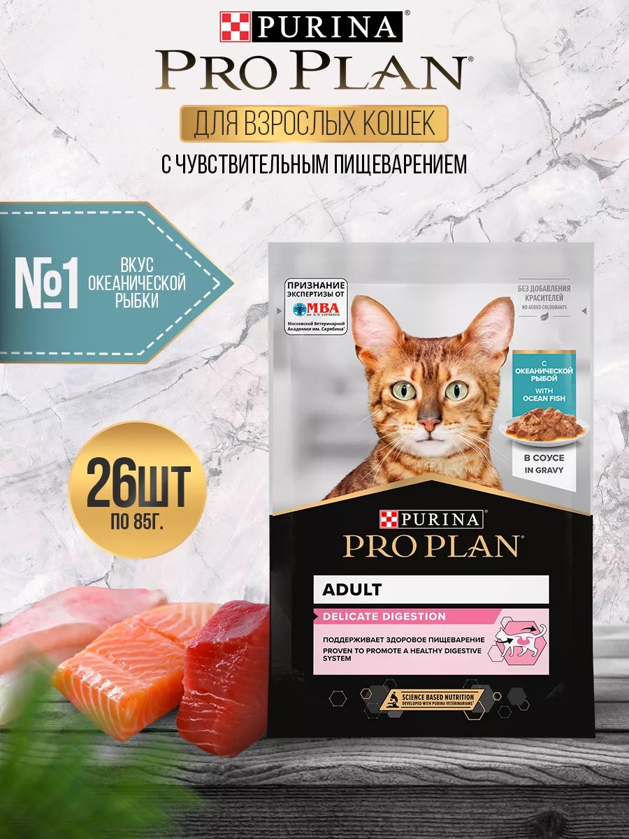 Влажный корм Purina PRO PLAN DELICATE DIGESTION Adult- это полнорационная и сбалансированная ежедневная кормежка для взрослых кошек с чувствительным пищеварением в упаковке 26*85 гр. Чувствительное переваривание пищи у кошки — особенность, которая быстро становится очевидной для хозяина: неприятный запах из лотка, привередливость животного в еде, затруднения в дефекации.