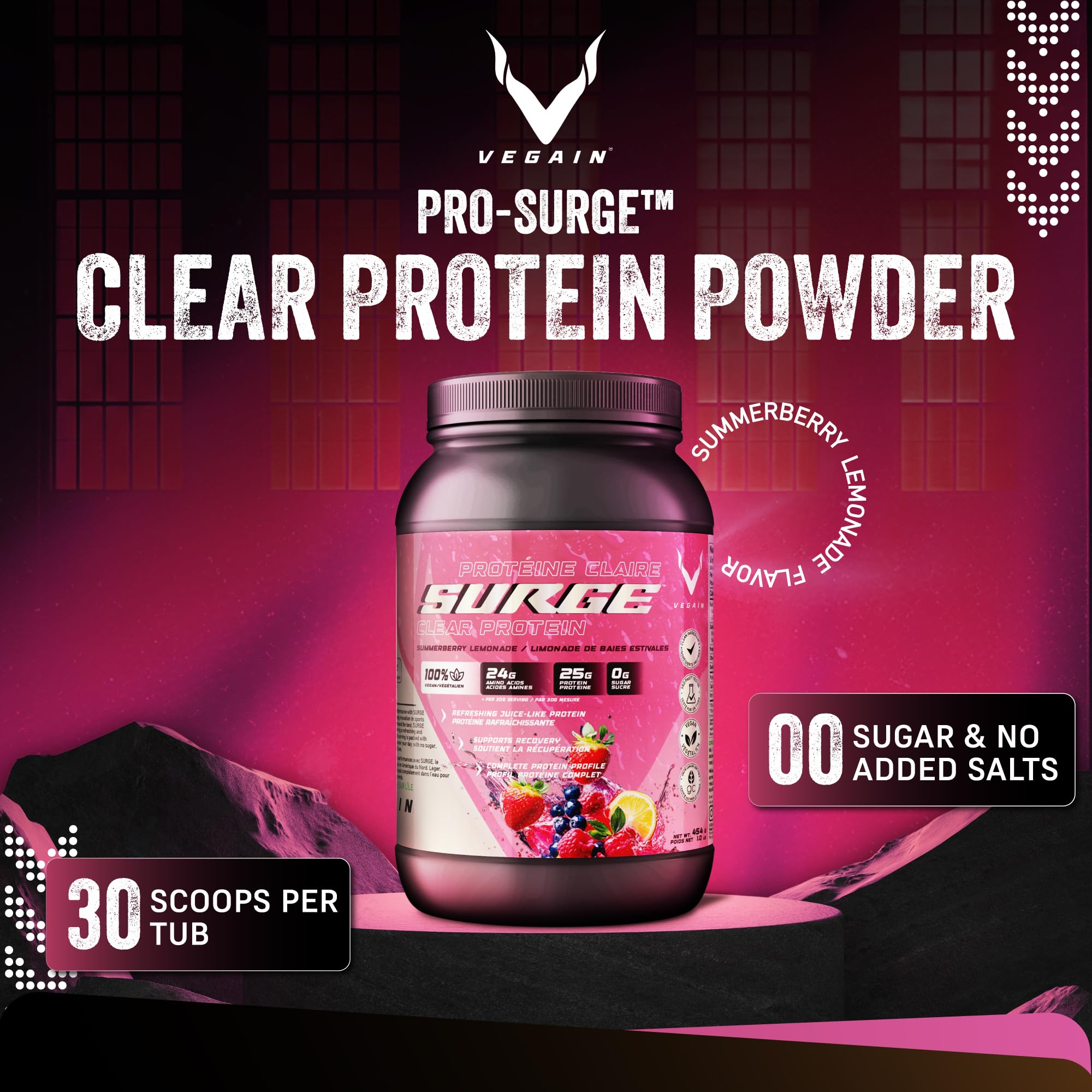 Who says protein shakes have to be heavy? PRO-SURGE Clear Protein Powder turns everyday protein into something refreshing, light, and effortlessly enjoyable. Made for anyone who wants clean nutrition with flavor that feels like summer, it's your new favorite way to refuel, hydrate, and stay strong. Each scoop delivers 25 grams of complete plant-based protein from high-quality yellow peas, providing all essential and branched-chain amino acids your muscles need to strengthen and grow. It's a clean, dairy-free, soy-free formula that gives your body everything it needs and nothing it doesn't. The Summerberry Lemonade flavor brings a bright, tangy sweetness that tastes like a cool sip of sunshine after a workout. No chalky texture, no milky heaviness, just smooth, crystal-clear refreshment that mixes instantly in water. Naturally occurring electrolytes from peas help replace what you lose during exercise, keeping you hydrated and balanced without added salts or sugars. And with only 112 calories per serving and zero sugar, PRO-SURGE fits perfectly into your fitness or wellness routine. Customers love how light it feels, no bloat, no discomfort, just clean energy that supports strength, recovery, and daily vitality. Whether you're hitting the gym, walking outdoors, or simply staying active, PRO-SURGE Clear Protein helps you feel good, stay hydrated, and enjoy every sip. Because wellness shouldn't be complicated or boring. Stay clear, strong, and refreshed with PRO-SURGE Clear Protein Powder, Summerberry Lemonade Flavor.Gentle, Clean, and Easy to Enjoy: Free from lactose, gluten, and common allergens, this light and clear protein is made for every body. It's easy on digestion, non-bloating, and perfect for anyone who wants to feel strong, light, and refreshed after every sip. Sugar-Free, Guilt-Free, Feel-Good Fuel: With zero sugar, just 112 calories per 30g serving, and a naturally sweet stevia finish, PRO-SURGE keeps your nutrition clean and your energy steady. Enjoy all the flavor of summer, no guilt, no crash, just refreshing, sustained energy. Hydration That Comes Naturally: Naturally occurring electrolytes from peas help replenish what you lose in sweat, keeping you hydrated, balanced, and feeling good from the inside out, no added salts, no artificial ingredients, just nature's own replenishment. Pure Plant Power for Real Results: Every 30g scoop packs 25g of premium plant protein isolate from yellow peas with all essential and branched-chain amino acids for nourishment, repair and lean muscle growth. 100 plant-based, no dairy, no soy, just clean, powerful performance fuel. A Clear, Refreshing Way to Do Protein: Say goodbye to heavy shakes and chalky textures. PRO-SURGE mixes crystal clear in seconds for a light, juice-like drink that bursts with sweet Summerberry Lemonade flavor, tangy, bright, and deliciously smooth.