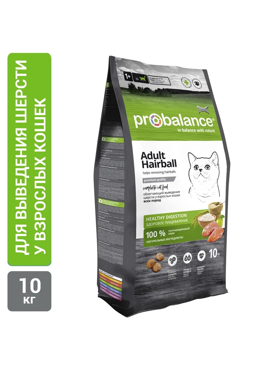 Probalance Hairball полнорационный натуральный сухой корм для кошек премиум класса, облегчающий выведение комочков шерсти. Ежедневный прием сухого корма для кошек и котов Probalance Hairball помогает справиться с выведением комочков шерсти. За функцию выведения шерсти отвечает именно натуральный рацион, как основное питание кошки. То есть это не какое-то дополнительное средство или таблетки, которыми нужно специально кормить кошку или кота, а их ежедневная еда. Все происходит естественно: питомец избавляется от шерсти, не прикладывая особых усилий, просто каждый день кушая свой корм.