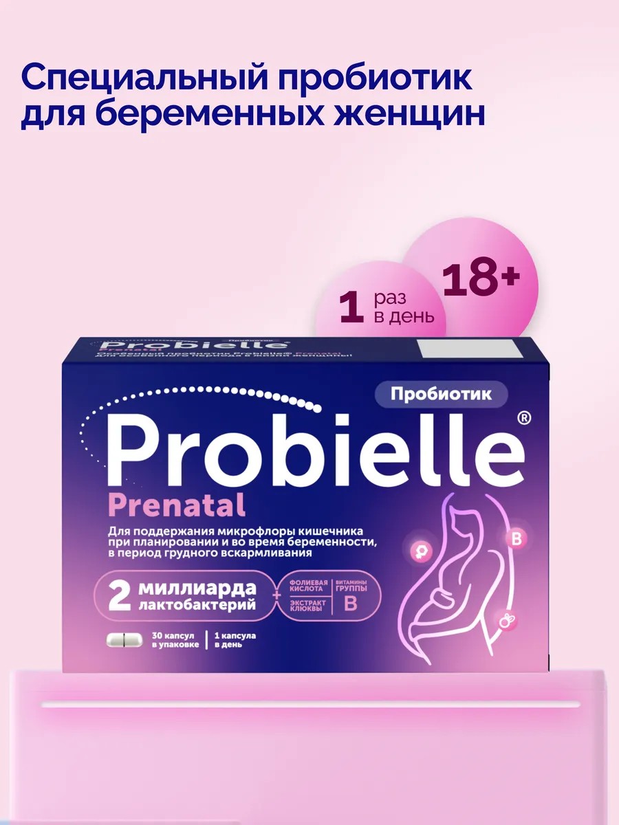 Биологически активная добавка к пище Пробиэль Пренатал – специально разработанная комбинация 2 миллиардов полезных лактобактерий, витаминов В1 и В2, фолиевой кислоты и экстракта плодов клюквы для поддержания естественного баланса микрофлоры кишечника при планировании и во время беременности, в период грудного вскармливания.
