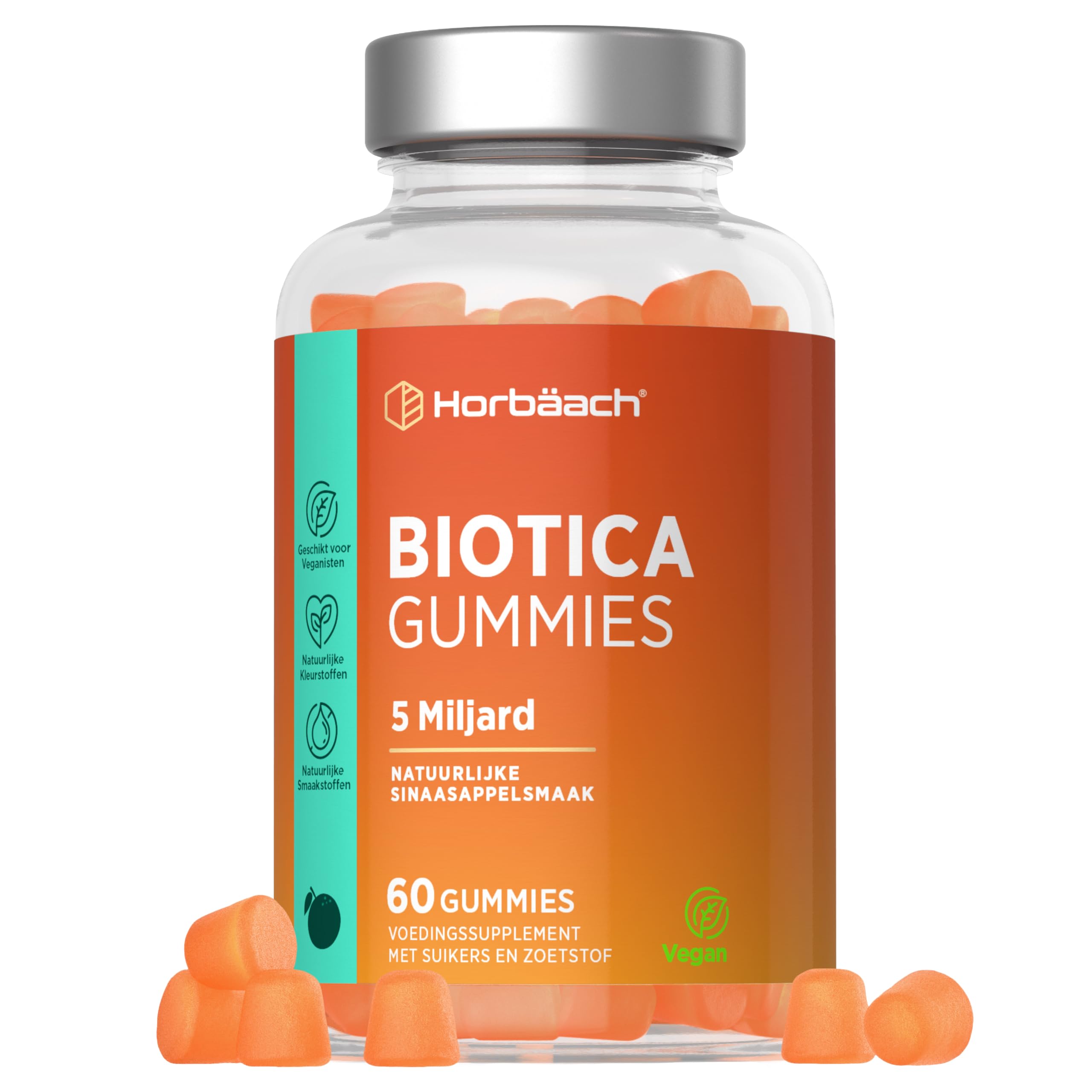 Biotic refers to live bacteria that are good for you, especially your digestive system. We usually think of bacteria as pathogens, but our bodies are actually teeming with both good and bad bacteria. It's reassuring to know that biocultures are often called good or friendly bacteria because they help keep your gut healthy. Biocultures can be found in dietary supplements and in certain foods like yogurt, kefir, sauerkraut, tempeh, kimchi, miso, kombucha, and many more. If you can't or don't want to eat these foods, supplementing is a safe way to experience the powerful benefits of biotics for your health. Enriched with vitamin C, which contributes to the normal function of the immune system and collagen formation for the normal function of bones, skin, and teeth. Vitamin B can help reduce tiredness and fatigue (increases energy levels). Horbaach Happy Gut fruit gummies contain 5 billion biotic bacteria per serving and are enriched with vitamins for added benefits and support. It's the best formula on the market! Simply take two (2) fruit gummies per day, preferably with a meal, and enjoy the benefits of this amazing biotic supplement. INGREDIENTS Glucose syrup, sugar, water, vitamin C (ascorbic acid), vitamin B3 (niacin as nicotinamide), vitamin B5 (calcium D-pantothenate), vitamin B6 (pyridoxine HCl), sweetener (xylitol), Lactobacillus casei LC89, Lactobacillus rhamnosus LRa05, Bifidobacterium infantis B145, maltodextrin (active ingredient premix), gelling agent (pectin), acid (citric acid), acidity regulator (sodium citrate), glazing agent (coconut oil and carnauba wax), natural colour (curcumin), natural flavouring (pineapple). DIRECTIONS FOR USE Adults take two (2) gummies daily, preferably with a meal. SAFETY WARNING Food supplements should not be used as a substitute for a varied and balanced diet and a healthy lifestyle. If you are pregnant, breastfeeding, taking medication, or have a medical condition, consult your doctor or healthcare professional before use. If an adverse reaction occurs, stop using this product immediately and consult your doctor. It is not intended for use by persons under the age of 18. See morePackaging may vary: We are in the process of updating our packaging. If the product you receive looks different, you can be assured that the benefits remain the same. Additionally, if your product is labeled in English, you will find a removable label with six additional languages for convenience. SUITABLE FOR: Horbaach Happy Gut Gummies are vegan, contain no artificial colors or preservatives and are suitable for both men and women. Yummy ALTERNATIVE TO TABLETS: Packed with natural tropical flavor, our chewable fruit gummies make it easier than ever to take care of your belly. THE BENEFITS: Extra multivitamins C, B3, B5 and B6. This combination of vitamins supports the immune system and helps reduce fatigue and exhaustion. These claims have been approved by EFSA (European Food Safety Authority). WHY SHOULD YOU CHOOSE HORBAACH'S BIOTIC GUMMIES? Our biotic gummies for adults are packed with friendly bacteria including: Bifidobacterium infantis, Lactobacillus rhamnosus, Lactobacillus casei.ProBio 5 Billion CFU 60 Veganistische Gummen Biotica Gummies for Men and Woman Digestive Health Horbaach Biotisch verwijst naar levende bacteriën die goed voor je zijn, vooral voor je spijsverteringssysteem. Meestal denken we bij bacteriën aan ziekteverwekkers, maar ons lichaam zit eigenlijk vol met zowel goede als slechte bacteriën. Het is geruststellend om te weten dat bioculturen vaak goede of vriendelijke bacteriën worden genoemd, omdat ze helpen om je darmen gezond te houden. Bioculturen zijn te vinden in voedingssupplementen en in bepaalde voedingsmiddelen zoals yoghurt, kefir, zuurkool, tempeh, kimchi, miso, kombucha en nog veel meer. Als je deze voedingsmiddelen niet kunt of wilt eten, is een supplement een veilige manier om de krachtige werking van biotisch op je gezondheid te ervaren. Verrijkt met vitamine C, dat bijdraagt aan de normale werking van het immuunsysteem en de collageenvorming voor de normale werking van botten, huid en tanden. Vitamine B kan helpen vermoeidheid en uitputting te verminderen (verhoogt het energieniveau). De Horbaach Happy Gut fruitgummies bevatten 5 miljard biotische bacteriën per dosering en zijn verrijkt met vitaminen om extra voordelen en ondersteuning te bieden. Het is de beste formule op de markt! Neem eenvoudig twee (2) fruitgummies per dag, bij voorkeur bij een maaltijd, en profiteer van de voordelen van dit geweldige biotische supplement. INGREDIËNTEN Glucosestroop, suiker, water, vitamine C (ascorbinezuur), vitamine B3 (niacine als nicotinamide), vitamine B5 (calcium-D-pantothenaat), vitamine B6 (pyridoxine-HCl), zoetstof (xylitol), Lactobacillus casei LC89, Lactobacillus rhamnosus LRa05, Bifidobacterium infantis B145, maltodextrine (werkzame-stof-premix), geleermiddel (pectine), zuur (citroenzuur), zuurteregelaar (natriumcitraat), glansmiddel (kokosolie en carnaubawas), natuurlijke kleurstof (curcumine), natuurlijk aroma (ananas). GEBRUIKSAANWIJZING Volwassenen nemen dagelijks twee (2) gummies, bij voorkeur bij een maaltijd. VEILIGHEIDSWAARSCHUWING Voedingssupplementen mogen niet worden gebruikt als vervanging voor een gevarieerde en evenwichtige voeding en een gezonde levensstijl. Als u zwanger bent, borstvoeding geeft, medicijnen gebruikt of een medische aandoening heeft, raadpleeg dan vóór gebruik uw arts of zorgverlener. Als er een bijwerking optreedt, stop dan onmiddellijk met het gebruik van dit product en raadpleeg uw arts. Het is niet bedoeld voor gebruik door personen jonger dan 18 jaar. Meer bekijkenVerpakking kan variëren: We zijn bezig onze verpakking te vernieuwen. Als het product dat u ontvangt er anders uitziet, kunt u er zeker van zijn dat de voordelen hetzelfde blijven. Als uw product bovendien in het Engels is geëtiketteerd, vindt u voor het gemak een afneembaar etiket met zes extra talen. GESCHIKT VOOR: Horba