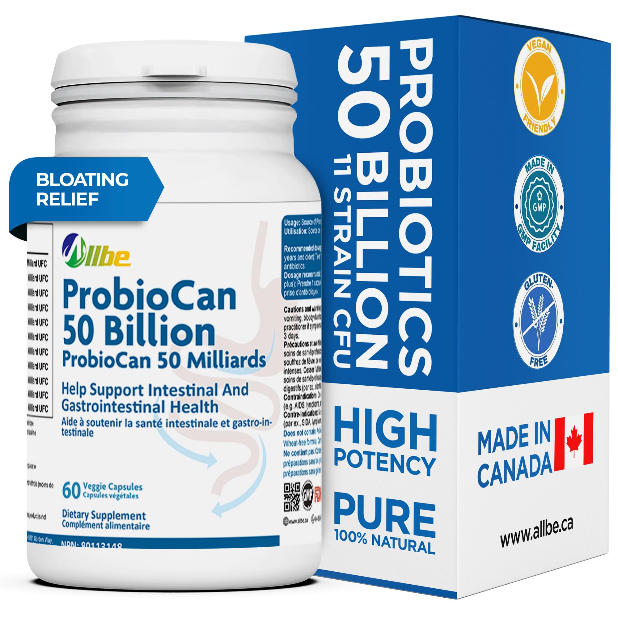 ALLBE ProbioCan 50 Billion promotes a favorable Gut Flora. It may reduce the indications of gas, diarrhea and bloating