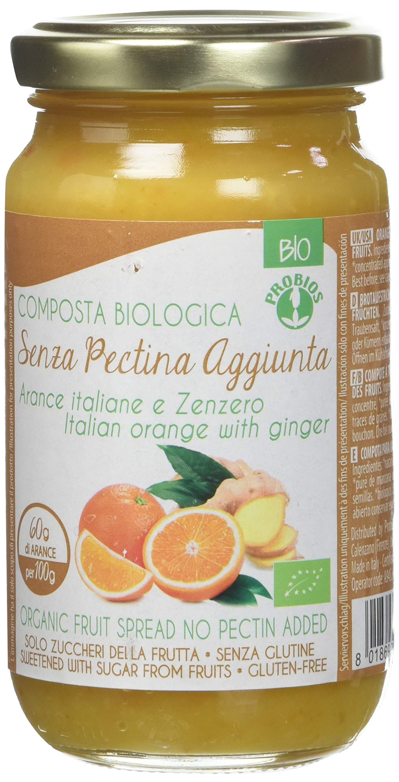 Exceptional range without added pectin, produced with a very high percentage of fruit Probios offers you traditional tastes and alternatives. These exceptional jams are sweetened with fruit juice only. Try the whole range in the 220g pack. INGREDIENTS orange peel pieces 60 , concentrated grape juice, concentrated apple puree, ginger 0.5 . organic. DIRECTIONS FOR USE Consume as directed on the packaging. SAFETY WARNING Do not expose to sunlight. Store in a cool, dry place. Organic. Only fruit sugars. Pectin-free. Gamme exceptionnelle sans addition de pectine, produite avec un pourcentage très élevé de fruits Probios vous propose des goûts traditionnels et des alternatives. Ces confitures exceptionnels sont édulcorés avec du jus de fruit uniquement. Essayez toute la gamme dans le pack de 220 g. INGRÉDIENTS orange écorce en morceaux 60 , jus de raisin concentré, purée de pomme concentré, gingembre 0,5 . bio. MODE D'EMPLOI A consommer tel qu'indiquer sur l'emballage. AVERTISSEMENT DE SÛRETÉ Ne pas exposer au soleil. A conserver dans un endroit frais et sec. Biologique. Seulement sucres des fruits. Sans Pectine.