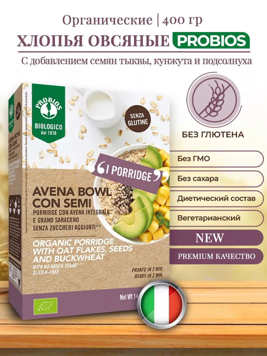 Овсяные хлопья с семенами без глютена от Probios - это кулинарное удовольствие, прямиком из сердца Италии. В составе только 100% натуральные ингредиенты, включая овсяные хлопья из цельно зернового овса и семена - подсолнечник, тыквенные семечки, лебеда, кунжут, чиа и голубой мак. Овсяная крупа без глютена сертифицирована Национальной системой здравоохранения Италии, поэтому экологичный полезный итальянский завтрак по новому Вам гарантирован! Важные особенности нашего эко продукта без добавок и консервантов: Органический/Organic, Без глютена/ Gluten free, Цельнозерновой продукт/ Whole grains, Подходит для вегетарианства, веганов/ Vegan.