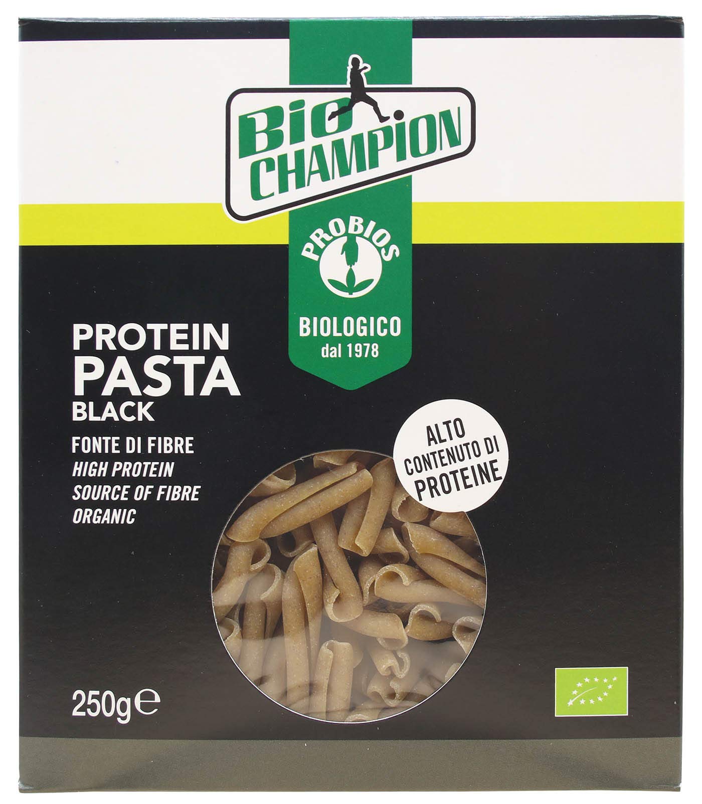 Biochampion Negro Protein Pasta is a high-protein pasta made with a single type of corn flour (Vicia faba) grown in Italy. It contains no emulsifiers or thickeners and is a natural source of fiber. This product is part of the innovative Biochampion Probios line: a range of organic products made in Italy, designed for those who embrace a dynamic, 100 natural lifestyle. A perfect alternative to classic protein pasta dishes, it cooks in 3 to 4 minutes in salted water and pairs well with simple, light vegetables and condiments. Guaranteed gluten-free, it is available in a 250g box. Also try the Golden Protein Pasta made with lupin flour. INGREDIENTS Corn flour (Vicia faba). Organic