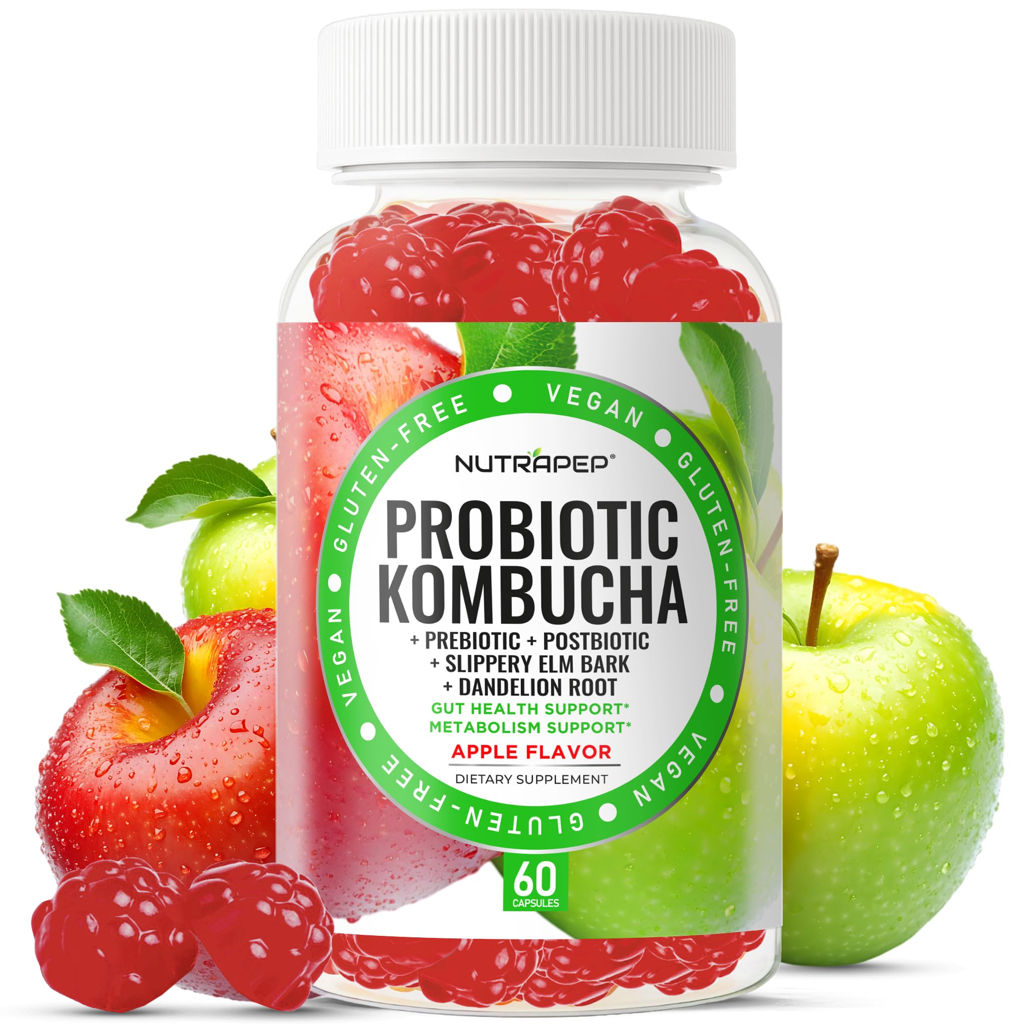 Vegan, Gluten-Free Gummies with Apple Flavor: Crafted with clean, natural ingredients, NutraPep Probiotic Kombucha Gummies are vegan, gluten-free, and flavored with a delicious apple taste. Each bottle contains 60 gummies, providing 30 servings to support gut health, metabolism, and overall wellness. Free from preservatives, artificial sweeteners, and colors, it offers a clean, effective, and enjoyable way to enhance daily health, making them a perfect addition to any health-conscious routine. Probiotic, Prebiotic Postbiotic Blend: NutraPep Probiotic Kombucha Gummies for Women and Men feature an enhanced blend of probiotic, prebiotic, and postbiotic to support gut health. With 2 billion CFU of probiotics per serving, these gummies help promote a healthy digestive system. Prebiotics nourish gut flora, ensuring the probiotics thrive, while postbiotics support immune function, working together to maintain digestive balance and overall wellness every day. Promote Wellness and Balance: The combination of Kombucha extract, Slippery Elm Bark, and Dandelion Root in NutraPep Probiotic Kombucha Gummies supports overall wellness and balance. These ingredients help promote a sense of calm, contributing to better mood and tranquility. They also support the body's natural detoxification processes, enhancing well-being and vitality, and providing a holistic approach to daily health. Support Healthy Metabolic Function: NutraPep Probiotic Kombucha Gummies support a healthy metabolism with the power of natural ingredients like Slippery Elm Bark and Dandelion Root. These ingredients help promote healthy digestion, boost energy levels, and support metabolism, making it easier for the body to process food and maintain a healthy weight. With consistent use, these gummies help balance metabolic function for long-term vitality. Kombucha-Powered Gut Health Support: NutraPep Probiotic Kombucha Gummies combine the power of Kombucha extract, Slippery Elm Bark, and Dandelion Root to promote a healthy gut. These natural ingredients work synergistically to support digestion, reduce bloating, and enhance gut balance. Regular use of these gummies helps maintain digestive health, promote a balanced gut environment, and improve overall well-being, making them a vital part of any wellness routine.