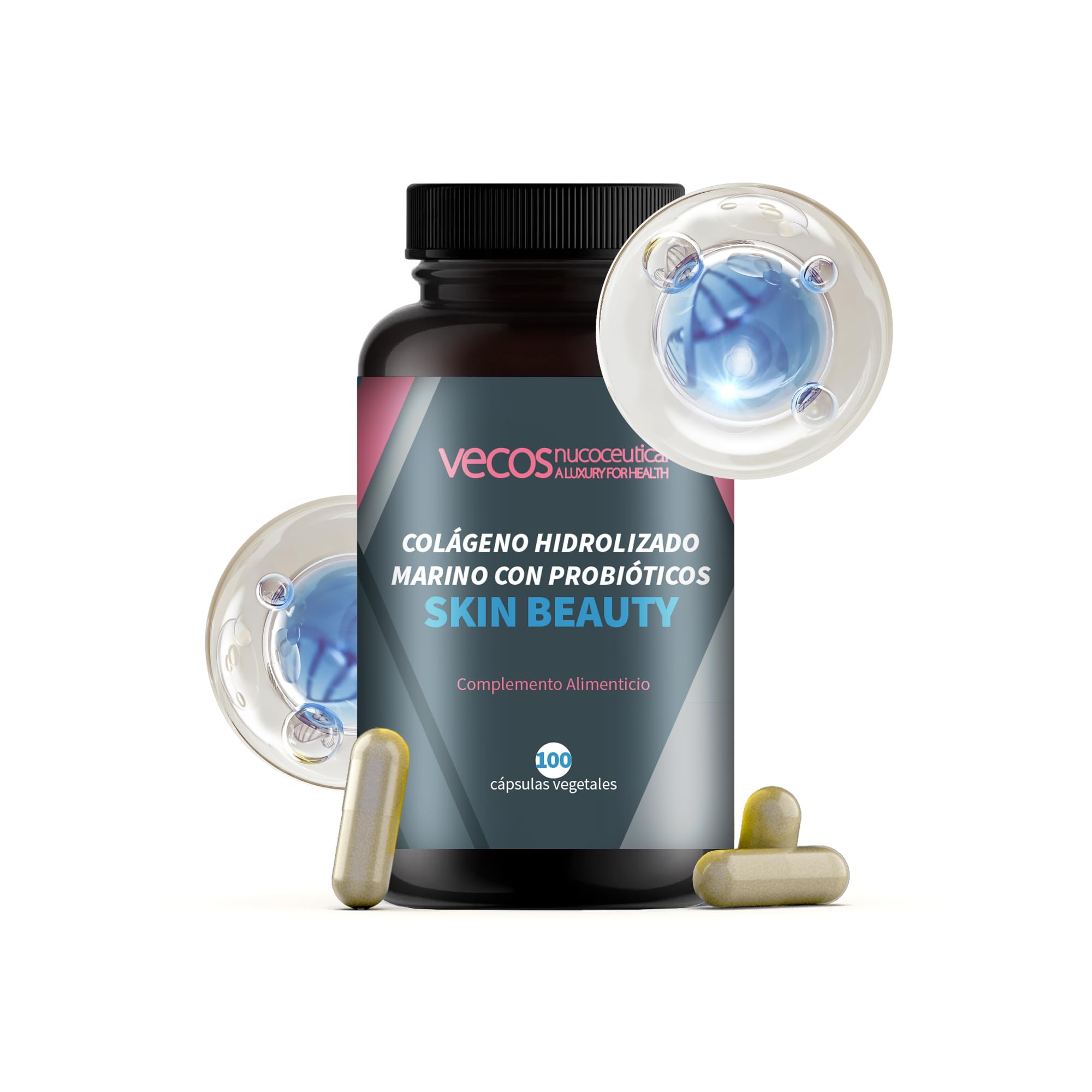 Garantie de qualité : chez VECOS nous sommes spécialisés dans l'élaboration et la commercialisation de compléments alimentaires. Tous nos produits sont fabriqués dans nos laboratoires professionnels, dotés d'installations de haute qualité. De cette façon, nous vous garantissons un service sûr et fiable. Ingrédients naturels : formulé à base de collagène hydrolysé marin avec élastine, probiotiques (bifidobactéries, lactobacilles et bacilles), vitamine C, coenzyme q10 et acide hyaluronique, ce supplément vous aidera à la formation normale du tissu conjonctif et favorise la synthèse du procollagène I. De plus, les probiotiques vous aideront à améliorer l'apparence de votre peau en renforçant votre barrière et votre flore cutanée. Utilisation recommandée : nous vous conseillons de prendre 3 capsules par jour, de préférence avec le petit-déjeuner. Il est recommandé de l'accompagner avec beaucoup d'eau. Conserver dans un endroit frais et sec, en gardant le récipient fermé et en évitant que la température ne dépasse 29 C. ? PROPRIÉTÉS ANTIOXYDANTES : Grâce à sa haute teneur en vitamine C, ce produit est idéal pour aider les cellules à lutter contre les radicaux libres et le stress oxydatif. De plus, la présence de collagène avec de l'élastine vous apportera des nutriments pour minimiser les rides d'expression, produisant un puissant effet anti-rides. Une peau saine ? C'est possible avec Skin Beauty. ? SUPPLÉMENT POUR SOIN DE VOTRE PEAU : Skin Beauty vous aidera à avoir un derme hydraté, jeune, lumineux, élastique et plein d'énergie. En outre, il contribue au bon maintien de celui-ci, à la formation normale du collagène et peut aider contre les situations d'acné, en gardant votre épiderme en bonne santé contre d'éventuelles altérations.