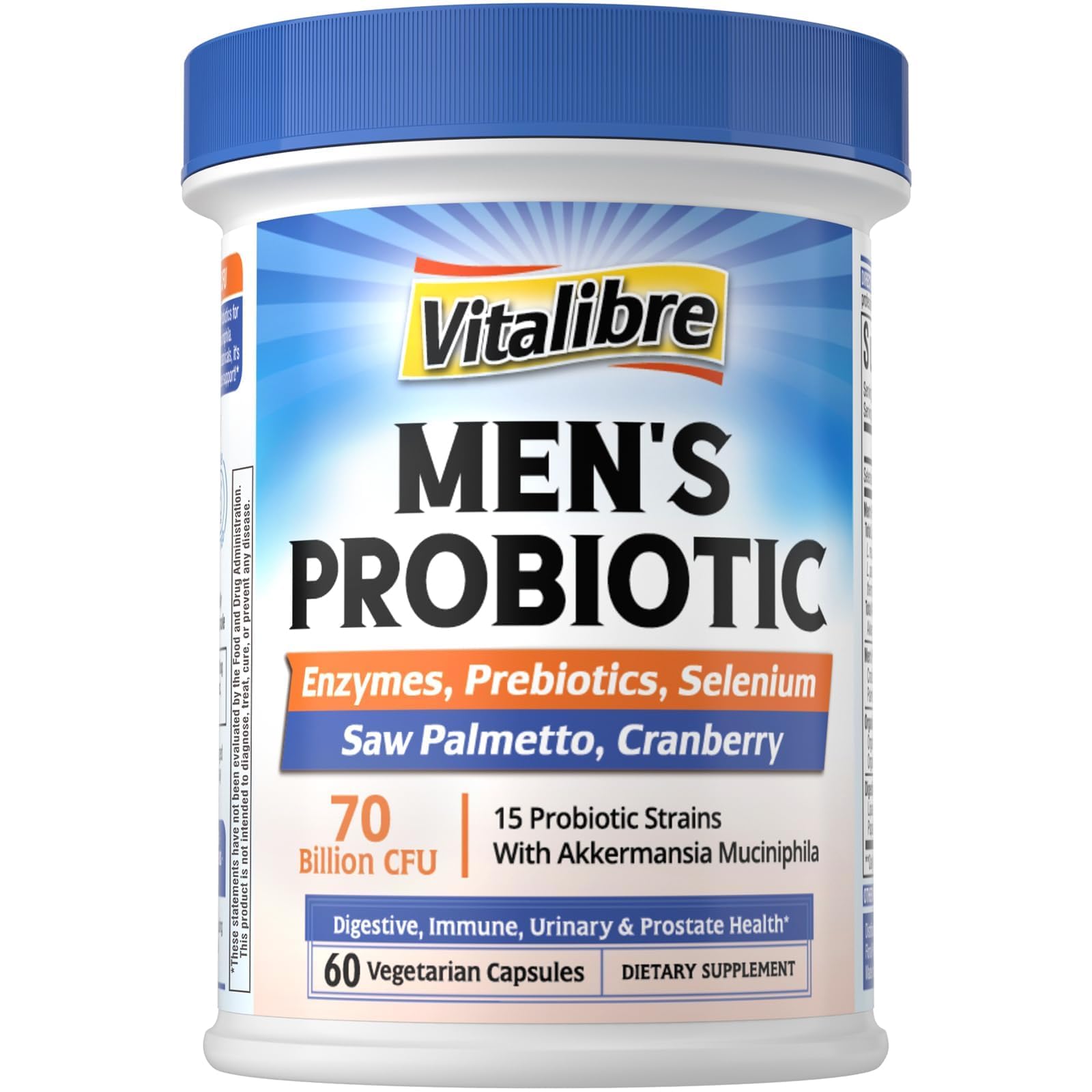 High Quality And Value: From meticulously sourcing the finest, most bioavailable ingredients to rigorously testing each formula, the team behind Vitalibre is driven by a relentless pursuit of purity and potency. Putting aside unnecessary fillers and artificial ingredients, we're committed to transparency in labeling and providing clear information contains zero sugar, gluten, dairy, soy, wheat, eggs, tree nuts peanuts. Made With You In Mind: Combining nature's nutrients with carefully crafted formulas, we create our first line of clean supplements to help you make confident choices for your health. We are proud to affirm all Vitalibre products are manufactured in the U.S in facilities that adhere to strict Good Manufacturing Practices (GMP) guidelines. Delayed Release Technology: Vitalibre probiotics are freeze-dried for enhanced stability and to keep the live cultures dormant before they reach your gut for guaranteed 70 Billion CFU potency. They are protected by acid-resistant capsules against stomach acid with delayed-release technology for improved survival through the acidic environment of the stomach, ensuring the probiotics reach the intestines and release where they're needed. No refrigeration required. Prostate and Urinary Tract Support : To meet men's unique needs, we've added Saw Palmetto and Cranberry Extract - two gender-specific nutrients to promote prostate health, urinary function, and hormone balance as you age. Plus, powerful antioxidants from Goji and Hawthorn Berry work to defend your cells and support heart health and energy. Feel your best with fewer bathroom trips and more vitality every day! . Specially Formulated for Men: Vitalibre Probiotics for Men features carefully craftedprobiotic strains, GLP-1 booster Akkermansia, and a proprietary blend of 8 enzymes for gut lining integrity, metabolic health and better nutrient absorption. You'll also receive essential mineral support with a full daily dose of Selenium, 100 of your recommended intake, providing support for antioxidant processes as well as male reproductive health. .