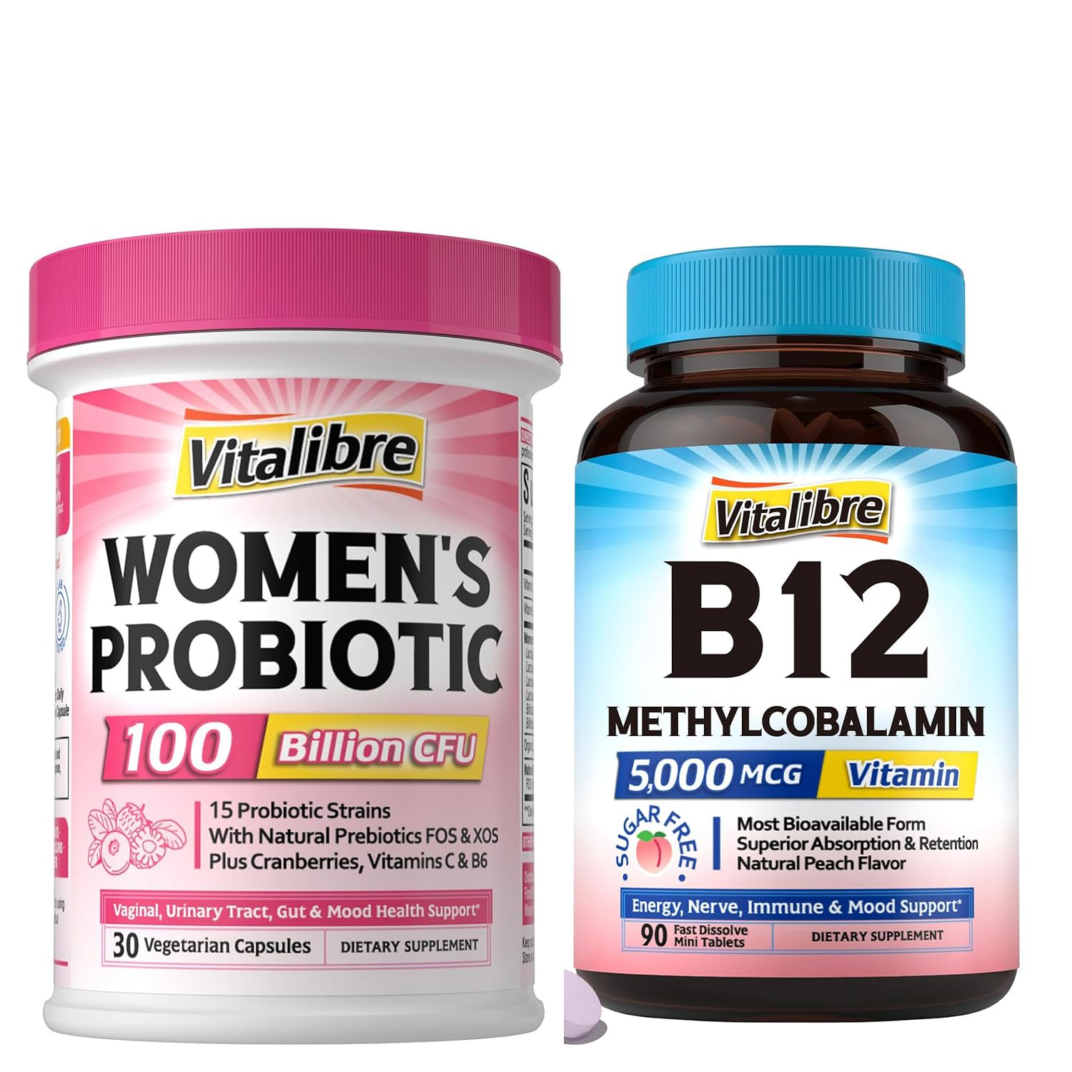 Made With You In Mind: Combining nature's nutrients with science-backed formulas, we create our first line of clean supplements to help you make confident choices for your health. We are proud to affirm all Vitalibre products are manufactured in the U.S in facilities that adhere to strict Good Manufacturing Practices (GMP) guidelines. High Quality And Value: From meticulously sourcing the finest, most bioavailable ingredients to rigorously testing each formula, the team behind Vitalibre is driven by a relentless pursuit of purity and potency. Putting aside unnecessary fillers and artificial ingredients, we're committed to transparency in labeling and providing clear information contains zero sugar, gluten, dairy, soy, wheat, eggs, tree nuts peanuts.Let Aside Unnecessaries: Putting aside unnecessary fillers and artificial ingredients, we're committed to transparency in labeling and providing clear information contains zero sugar, gluten, dairy, soy, wheat, eggs, tree nuts peanuts. High Quality And Value: From meticulously sourcing the finest, most bioavailable ingredients to rigorously testing each formula, the team behind Vitalibre is driven by a relentless pursuit of purity and potency. Best Absorbed Vegan B12: Vitalibre Vitamin B12 features tissue-ready active B12 (methylcobalamin), achieving high absorption retention in your body. Derived from natural fermentation, this vegan-friendly formula provides a perfect source of B12 for those who don't eat meat. Digestive, Immune and Hormone Support : Our women's probiotics keeps every feminine health aspects in check. Probiotics work with prebioics to diversity and repopulate your gut and vaginal flora and relieve occasional digestive discomforts. Organic cranberry extract and vitamin C help strengthen immune function and shield the urinary tract from worst offender. Specially-added bioavailable vitamin B6 keeps hormone balanced during period and menopause. . Advanced 5-in1 Women's Probiotics: We've included 100 Billion CFU of 15 diverse probiotic strains with organic food-based prebiotics, women-friendly cranberry extract, immune-boosting vitamin C and specially-added bioavailable vitamin B6 (P5P). This advanced 5-in1 probiotics for women is carefully designed to target women's unique health needs. .