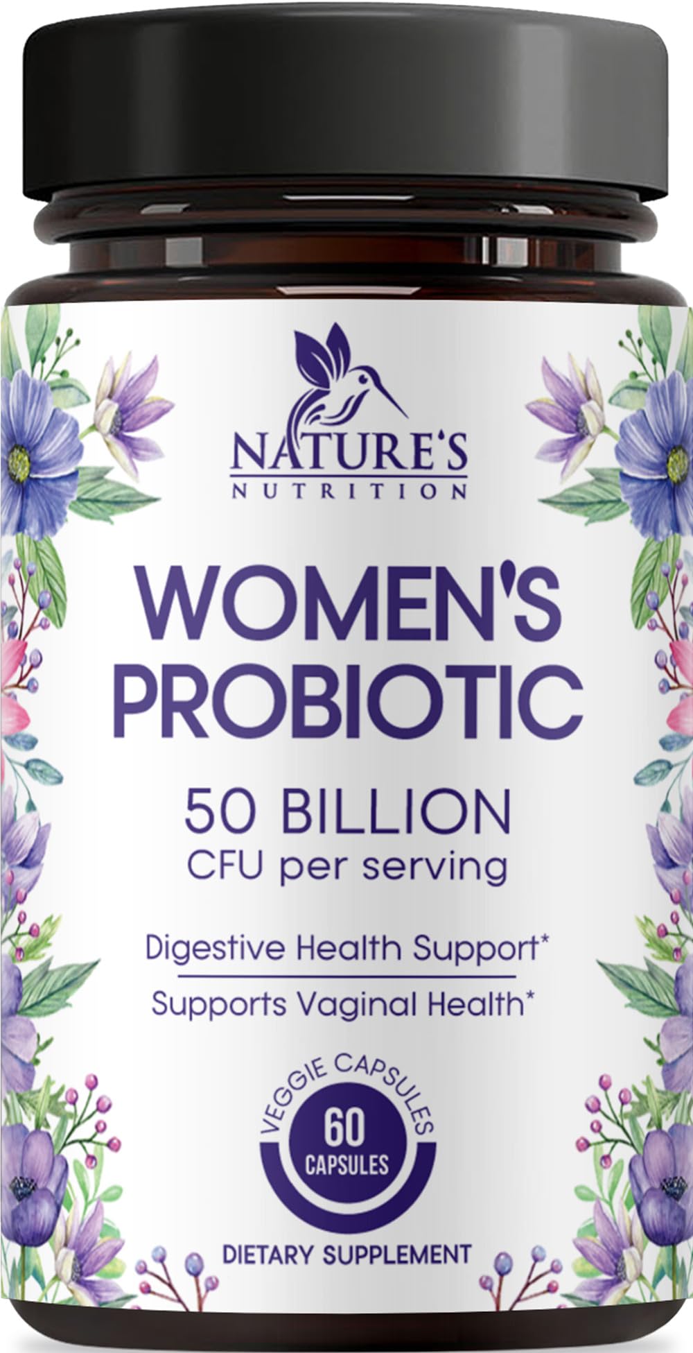 Nature's Nutrition Probiotics for Women's Digestive Health deliver 50 billion CFU from 5 unique strains to support gut flora, immune support, and womens health. This womens probiotic supports urinary tract and womens probiotic vag health. Each probiotic women capsule blends probiotics women, probioticos women, and probioticos mujer for total probotics womens digestive support. Enriched with prebiotics, these probiotic nutritional supplements help absorption and comfort. Our vegan, gluten-free women probiotic is bottled in the USA—premium probiotic, probiotics for women, and pro biotics women support for lasting womens health.