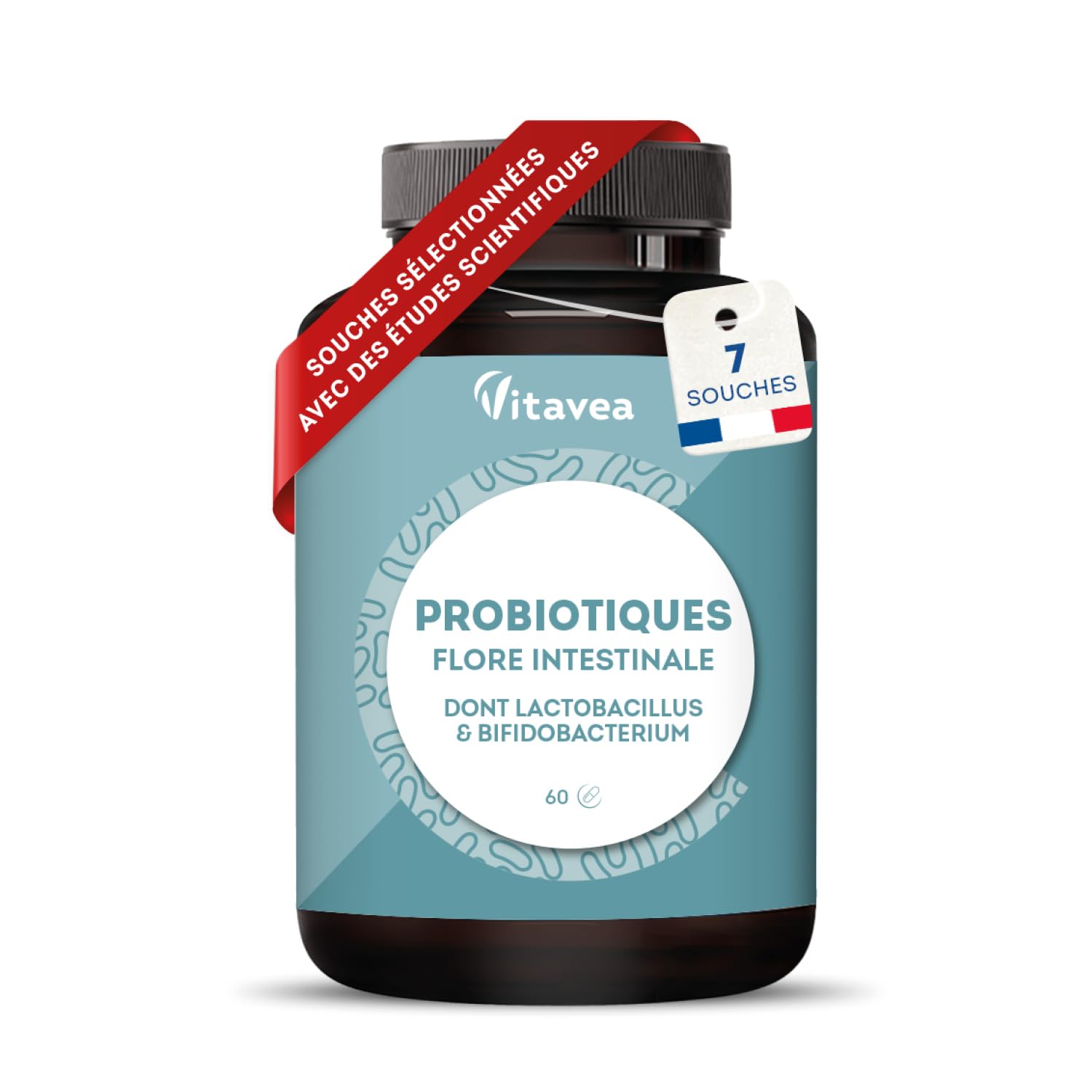 Ingredients: Corn starch vegetable capsule (cellulose derivative) probiotic complex: corn maltodextrin, Lactobacillus acidophilus, Lactobacillus rhamnosus, Lactobacillus casei, Lactococcus lactis, Bifidobacterium bifidum, Bifidobacterium breve, Streptococcus thermophilus anti-caking agent: magnesium salts of fatty acids. Directions for use: 2 capsules per day, to be swallowed with a glass of water. Ingredients: Corn starch vegetable capsule (cellulose derivative) probiotic complex: corn maltodextrin, Lactobacillus acidophilus, Lactobacillus rhamnosus, Lactobacillus casei, Lactococcus lactis, Bifidobacterium bifidum, Bifidobacterium breve, Streptococcus thermophilus Anti-caking agent: magnesium salts of fatty acids. P.when('A').execute(function(A) { A.on('a:expander:toggle_description:toggle:collapse', function(data) { window.scroll(0, data.expander. expander[0].offsetTop-100) }) }) Directions for use: 2 capsules per day, to be swallowed with a glass of water. Safety Warning: Do not exceed the recommended daily dose. Consume as part of a varied and balanced diet and a healthy lifestyle. Keep out of reach of children. Not recommended for children under 3 years of age. See moreMADE IN FRANCE: Developed by micronutrition experts, this Probiotic food supplement is gluten-free, lactose-free, and free of artificial colors. It is manufactured in our laboratories in the Vendée region of France according to strict standards, guaranteeing impeccable quality. IMMUNE SUPPORT: Boost your natural defenses with precisely dosed probiotics, essential for a healthy and balanced gut flora, the key to optimal overall health. CONVENIENT ECONOMICAL FORMAT: 60 vegetarian capsules for a 1-month course. Simply take 2 to 4 capsules daily with a glass of water. A simple routine for your daily balance. ENHANCED DIGESTIVE HEALTH: Improve your digestion and soothe digestive discomfort with a targeted formula that effectively acts on your microbiota for lasting well-being. GUT FLORA PROBIOTICS: An innovative probiotic complex with 28 billion CFU and 7 strains including Lactobacillus and Bifidobacterium, selected for their proven benefits on digestion, transit, and immunity. Scientifically studied strains for optimal results.Description du produit Ingrédients : Amidon de maïs gélule d'origine végétale (dérivé de cellulose) complexe de probiotique : maltodextrine de maïs, Lactobacillus acidophilus, Lactobacillus rhamnosus, Lactobacillus casei, Lactococcus lactis, Bifidobacterium bifidum, Bifidobacterium breve, Streptococcus thermophilus anti-agglomérant : sels de magnésium d'acides gras. Conseils d'utilisation : 2 gélules par jour, à avaler avec un verre d'eau. Ingrédients Amidon de maïs gélule d'origine végétale (dérivé de cellulose) complexe de probiotique : maltodextrine de maïs, Lactobacillus acidophilus, Lactobacillus rhamnosus, Lactobacillus casei, Lactococcus lactis, Bifidobacterium bifidum, Bifidobacterium breve, Streptococcus thermophilus anti-agglomérant : sels de magnésium d'acides gras. P.when('A').execute(function(A) { A.on('a:expander:toggle_description:toggle:collapse', function(data) { window.scroll(0, data.expander. expander[0].offsetTop-100) }) }) Mode d'emploi 2 gélules par jour, à avaler avec un verre d'eau. Avertissement De Sûreté Ne pas dépasser la dose journalière recommandée. À consommer dans le cadre d'une alimentation variée et équilibrée et d'un mode de vie sain. Garder hors de portée des enfants. Déconseillé aux enfants de moins de 3 ans. Voir plusFABRICATION FRANCAISE : Développé par des experts en micronutrition, ce complément alimentaire Probiotiques est sans gluten, sans lactose et sans colorant artificiel. Il est fabriqué dans nos laboratoires en Vendée selon des normes strictes, garantissant une qualité irréprochable. SOUTIEN IMMUNITAIRE : Boostez vos défenses naturelles grâce à des probiotiques justement dosés, essentiels pour une flore intestinale saine et équilibrée, clé d'une santé globale optimale. FORMAT PRATIQUE ÉCONOMIQUE : 60 gélules végétales pour 1 mois de cure. Prenez simplement 2 à 4 gélules par jour avec un verre d'eau. Une routine simple pour votre équilibre au quotidien. SANTÉ DIGESTIVE RENFORCÉE : Améliorez votre transit et apaisez les inconforts digestifs grâce à une formule ciblée qui agit efficacement sur votre microbiote pour un bien-être durable. PROBIOTIQUES FLORE INTESTINALE : Complexe innovant de probiotiques avec 28 milliards d'UFC et 7 souches dont Lactobacillus et Bifidobacterium, sélectionnés pour leurs bienfaits prouvés sur la digestion, le transit et l'immunité. Des souches scientifiquement étudiées pour des résultats optimaux.Probiotique Flore Intestinale - 7 souches dont Lactobacillus Bifidobacterium - 28 Milliards d'UFC jour - Transit Microbiote Intestinal - 60 Gélules Végétales – Fabriqué en France - Vitavea