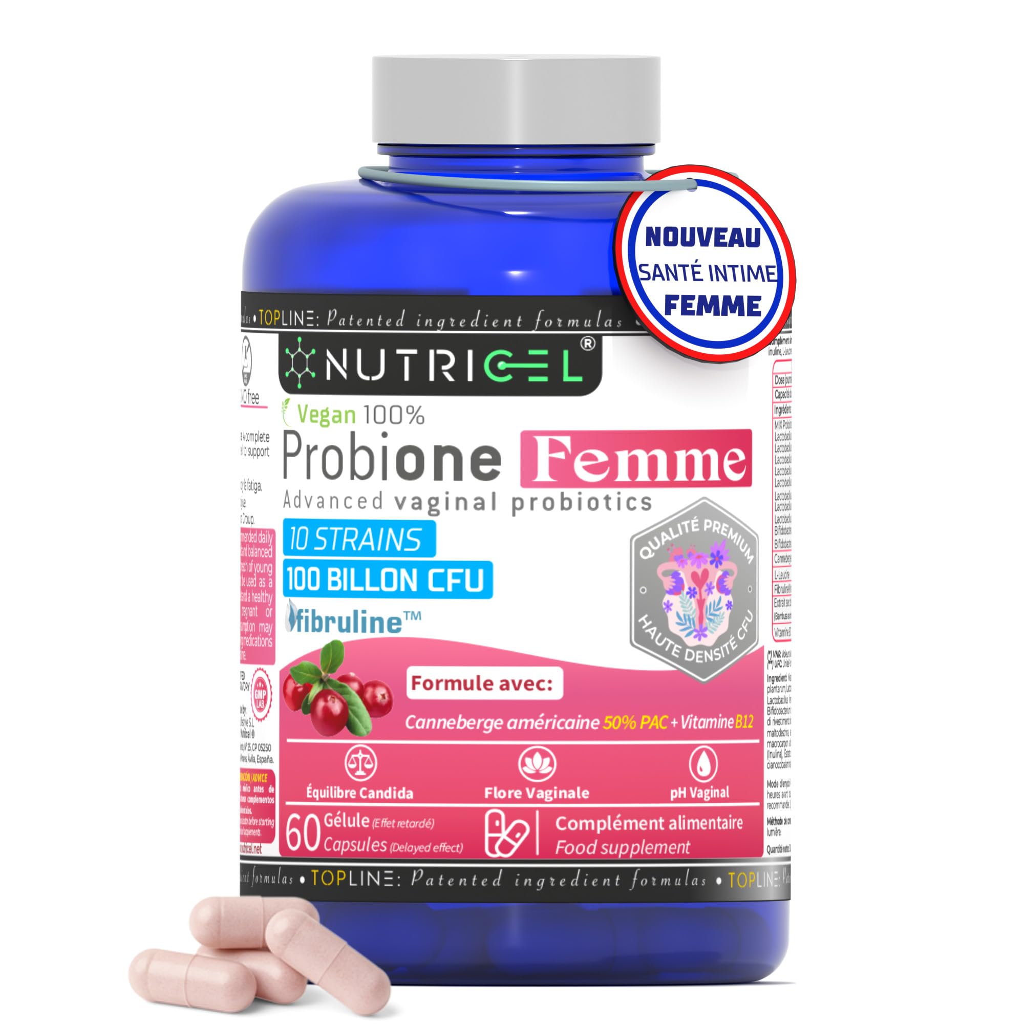 GARANTIE DE SATISFACTION : La satisfaction des clients est la raison d'être de Nutricel. Pour toute question ou suggestion, n'hésitez pas à nous contacter. Notre équipe de nutritionnistes et d'experts vous proposera la meilleure solution dans les plus brefs délais. PRODUIT CERTIFIÉ ET AUX INGRÉDIENTS BREVETÉS : Probione Balance est un complément 100 naturel, fabriqué dans des laboratoires nationaux de premier plan qui respectent les normes strictes nationales et européennes, en suivant les processus de fabrication ISO 9001 et GMP (Bonnes Pratiques de Fabrication). Produit cruelty free, élaboré avec des pratiques durables et respectueuses de l'environnement. COMPLÉMENT 100 VÉGAN, SANS GLUTEN, SANS LACTOSE NI ADDITIFS AGRESSIFS : Probione Femme de la gamme TOP LINE de Nutricel se présente sous forme de gélules végétales faciles à avaler, sans stéarate de magnésium ni dioxyde de silicium. Son format minimise les agents agglomérants et améliore l'absorption, avec une libération retardée pour une meilleure action digestive. Sans OGM, colorants ni édulcorants, idéal pour les femmes recherchant pureté, efficacité et tolérance intestinale maximale. TRAITEMENT DE CHOC POUR LA FLORE INTIME ET LE MICROBIOTE FÉMININ – 2 GÉLULES PAR JOUR : Probione Femme associe 100 milliards UFC jour d'unités formatrices de colonies de 10 souches probiotiques avec de l'inuline Fibruline et de la canneberge américaine. Il aide à rétablir l'équilibre vaginal et digestif, soulage les inconforts courants et renforce les défenses. Enrichi en vitamine B12 et en acide ellagique issu de l'extrait de grenade, puissant antioxydant. Idéal comme traitement intensif ou comme entretien quotidien. PROBIOTIQUES POUR LA SANTÉ INTIME FÉMININE – 100 MILLIARDS UFC jour D'UNITÉS FORMATRICES DE COLONIES : Probione Femme de Nutricel offre l'une des concentrations les plus élevées de probiotiques et prébiotiques pour la santé intime des femmes. Avec 100 milliards d'unités formatrices de colonies provenant de 10 souches, agissant en synergie avec l'inuline Fibruline (fibre de chicorée 100 végane), il favorise l'équilibre vaginal et prévient les infections. Enrichi en canneberge américaine et en vitamine B12, il soutient les défenses et améliore la santé intime féminine.
