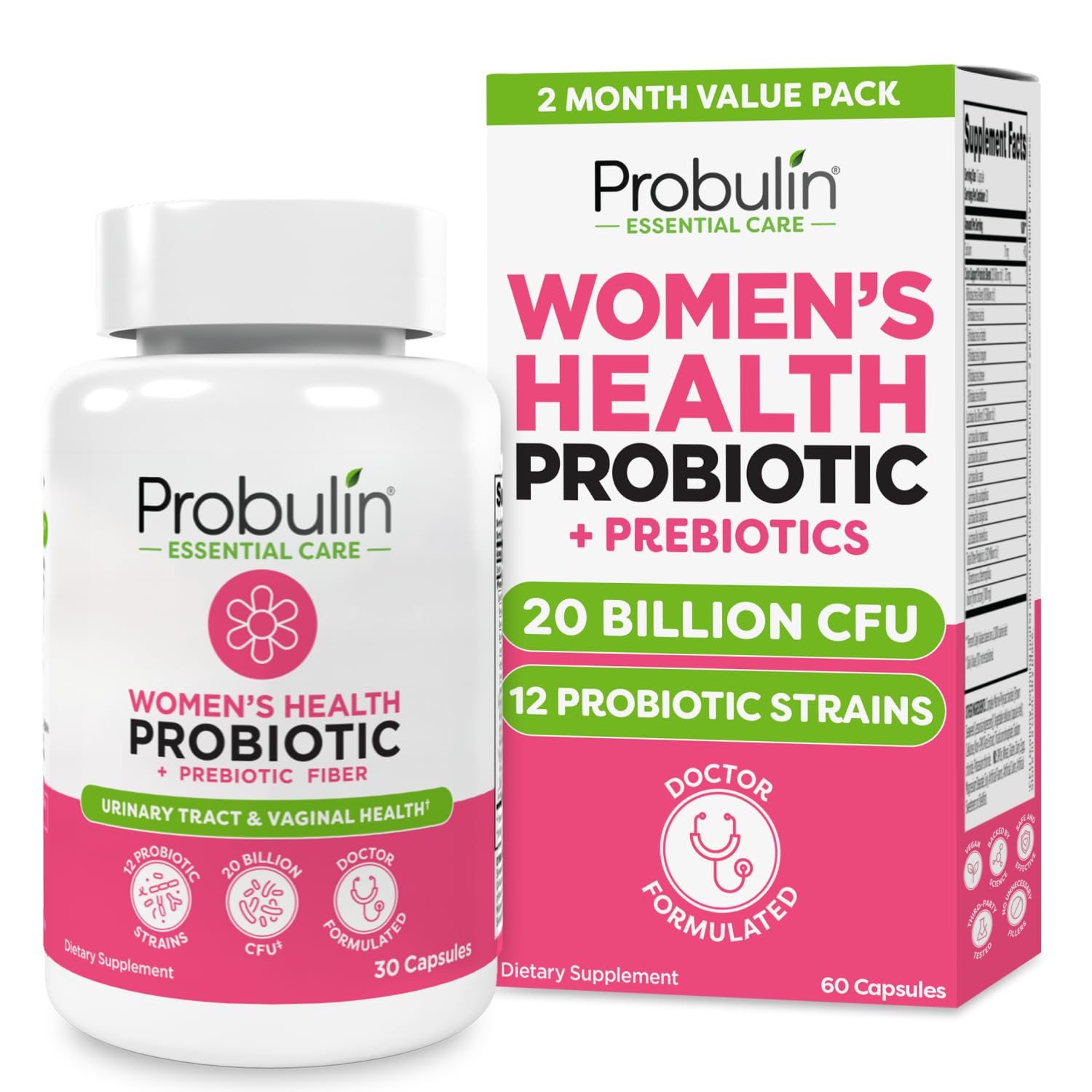 Probulin Womens Probiotic - Vaginal UT Gut & Immune Health with Lactobacillus Reuteri - 20 Billion CFU 12 Probiotic Strains & Prebiotics - 60 Vegan Gluten Free Capsules for Whole-Body Wellness Women's Health Daily - 60
