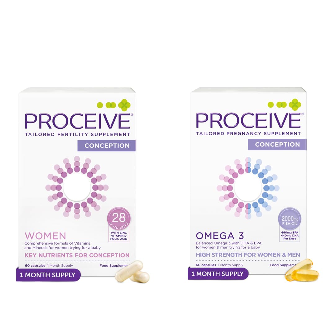 Clean, Expert-Formulated Ingredients: Made with bioavailable nutrients and sustainably sourced fish oil. Free from heavy metals, artificial colors, fillers, binders, and preservatives. Easy Daily Routine: Take two capsules daily of each supplement (Women Omega-3) with a full stomach in the morning. For best results, begin at least three months before trying for a baby. Proactive Fertility Support: Proceive's clinically informed range delivers targeted, high-quality nutritional support for both partners on their fertility journey. High-Strength Omega-3 for Reproductive Health: Delivers 2,000mg Omega-3 per daily dose with 660mg EPA 440mg DHA to help support healthy sperm and egg cell function. Comprehensive Fertility Support for Couples: Proceive Tailored Fertility Omega-3 Bundle provides complete nutritional support for women and men preparing for pregnancy. Includes 60 capsules each (1-month supply).