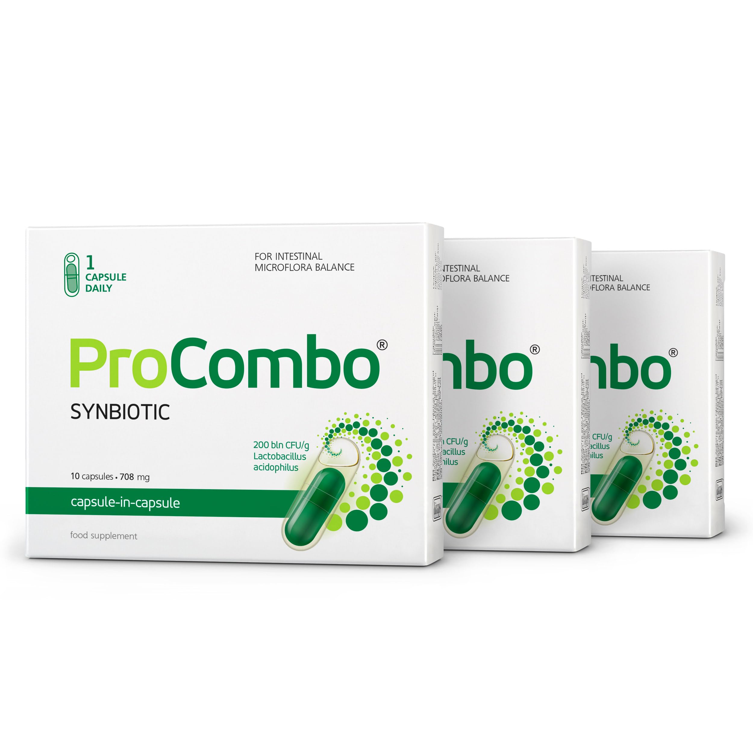 With just 1 capsule per day, ProCombo supplies the optimal amount of "good" bacteria needed to restore the balance of the intestinal microflora and for the normal functioning of the abdomen.