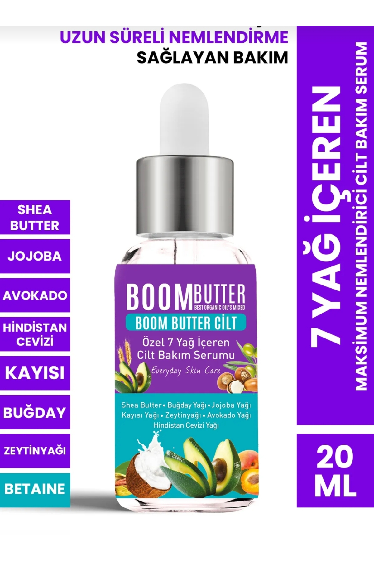 Boom butter cilt bakim serumu, içerisindeki 7 dogal yagin destegiyle cilt yüzeyinin daha uzun süreli nemli kalmasina ve cilt kuruluguna yönelik bakima yardimci olmasi için gelistirdigimiz bir cilt bakim serumudur. Içerisindeki shea, jojoba, avokado ve hindistan cevizi yagi ile cildin sebum dengesinin saglanmasina destek verirken, kayisi yagi içerigiyle daha canli ve pürüzsüz bir cilt tonu görünümüne ulasilmasi amaçlanmaktadir. Bugday yagi içerigiyle günes ve çevresel kosullara karsi cildin korunmasina katki saglarken zeytinyaginin destegiyle siyah noktalara yönelik bakima yardimci olmayi hedeflemektedir.