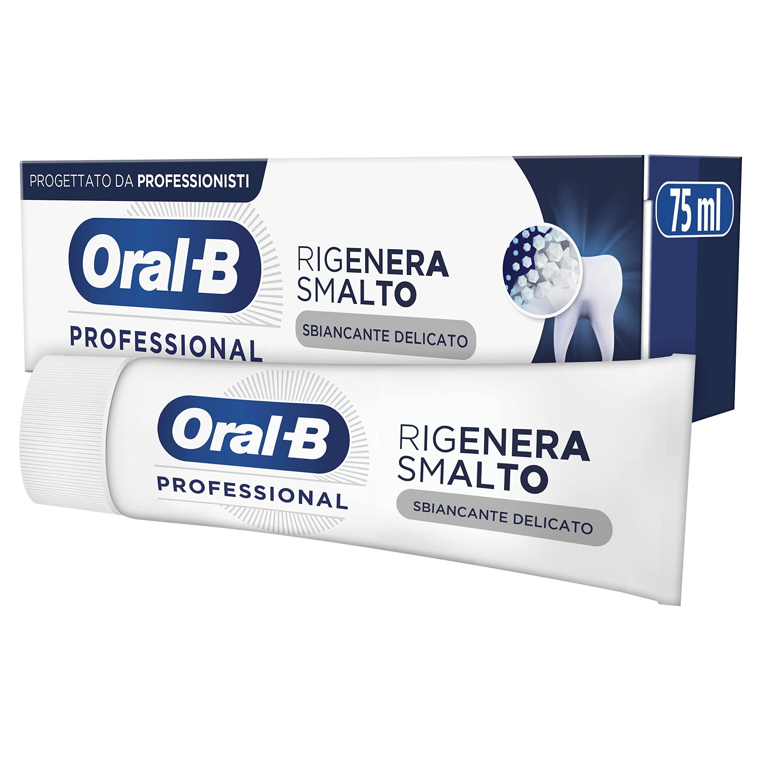Did you know that the nail polish on the tooth surface loses density over time? Oral-B Professional toothpaste regenerates nail polish increases the density of the nail polish while brushing to keep teeth healthier. Remineralizes the tooth surface and makes it stronger. Protects the nail polish against loss of tooth density.mint and eucalyptus. Smooth, creamy paste. Helps to protect the nail polish against future loss of tooth density. Remineralizes the tooth surface to strengthen it. Actively regenerates tooth density.Oral-B Professionele Tandpasta, geregenereerd, Zachte nagellak, 75 ml Wist je dat de nagellak op het tandoppervlak na verloop van tijd aan dichtheid verliest? Oral-B Professional tandpasta regenereert nagellak verhoogt de dichtheid van de nagellak tijdens het borstelen om de tanden gezonder te houden. Remineriseert het tandoppervlak en maakt het sterker. Beschermt de nagellak tegen verlies van tanddichtheid.munt en eucalyptus. Gladde, romige pasta. Helpt om de nagellak te beschermen tegen toekomstig verlies van tanddichtheid. Remineraliseert het tandoppervlak ter versterking. Regenereert actief de tanddichtheid.