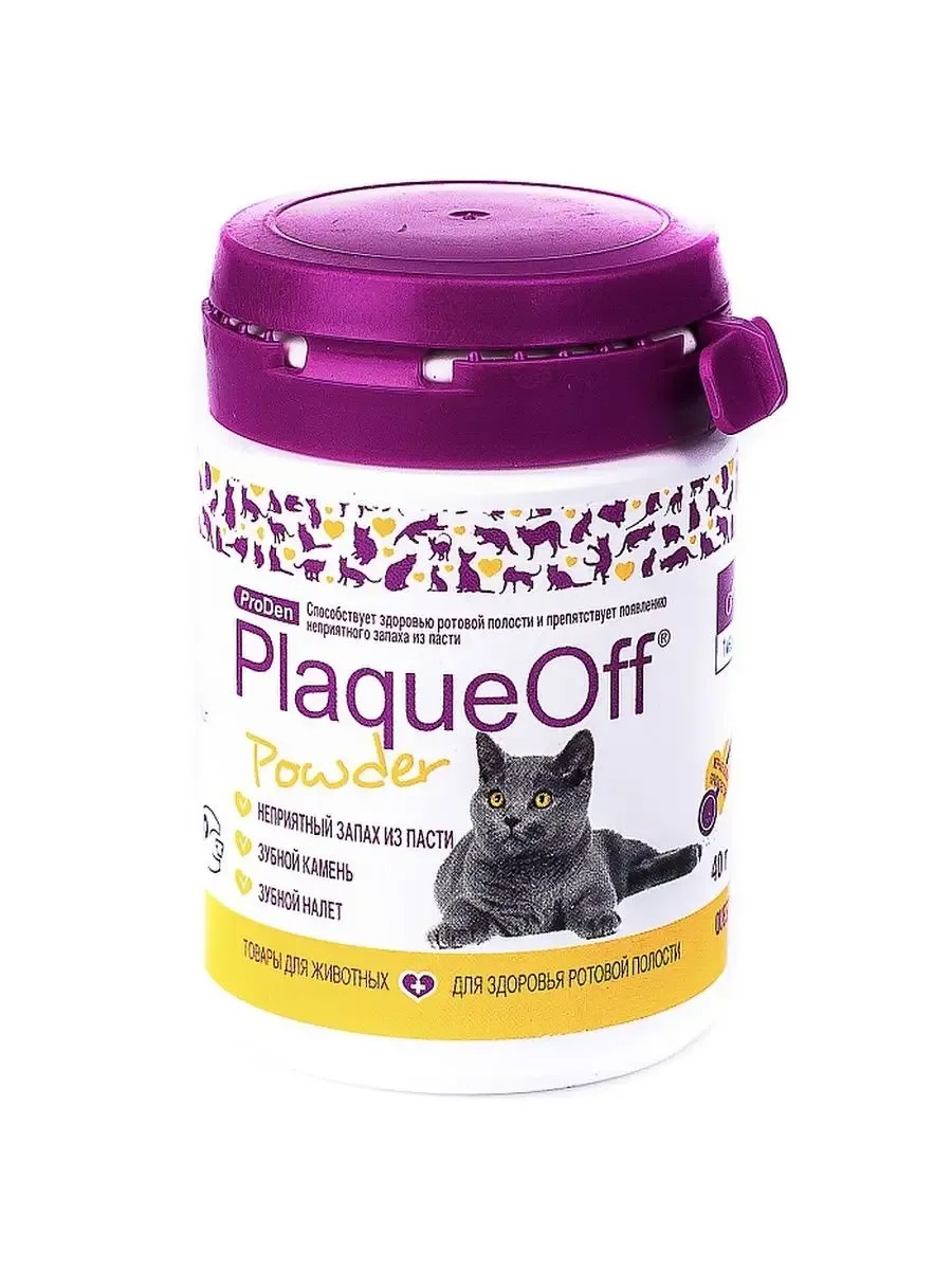ProDen PlaqueOff Powder Cat - это запатентованная натуральная кормовая добавка, которая, как клинически доказано, значительно уменьшает неприятный запах изо рта, зубной налет и зубной камень у кошек. ProDen PlaqueOff Powder Cat производится из морских водорослей Ascophyllum nodosum. Поскольку кошки известны своим более разборчивым вкусом, в этот продукт добавлены пивные дрожжи - ингредиент, который нравится большинству кошек.Полностью натуральный продукт ProDen PlaqueOff Powder Cat не содержит добавок и искусственных консервантов, а также глютена или добавленного сахара.БИОЛОГИЧЕСКИЕ СВОЙСТВАPlaqueOff полностью натуральный продукт, состоит из Ascophyllum nodosum - это бурая морская водоросль, произрастающая только в Североатлантическом бассейне. Она растет в виде длинных листьев на скалах и собирается в Исландии, Норвегии и Ирландии. В отличие от большинства других средств для борьбы с зубным налетом, PlaqueOff работает системно. Ингредиенты всасываются в кровь через пищеварительную систему и входят в состав слюны, эффективно предотвращая накопление зубного налета, неприятный запах изо рта, позволяет уменьшить налет и зубной камень на зубах и деснах, изменяют рН слюны в сторону щелочной и приближают к норме. Уже существующий зубной камень под действием средства становится пористым, разрыхляется и может быть легко удален с помощью щетки или других методов очистки. Изменение рН ротовой полоти в щелочную сторону связано с увеличением количества кальция и фосфора в слюне. Если рН слюны снижается, то это говорит о недостатке кальция и фосфора в слюне, что отрицательно сказывается на состоянии эмали.Наличие кальция и фосфора в слюне обеспечивает поддержание постоянства состава тканей зуба. Высокое содержание кальция и фосфора в слюне: препятствует растворению эмали; обеспечивает поступление ионов кальция и фосфора в эмаль
