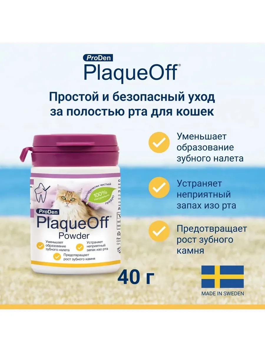 | Комплектация | Кормовая добавка ProDen PlaqueOff средство профилактика зубного камня у кошек 40 гр |