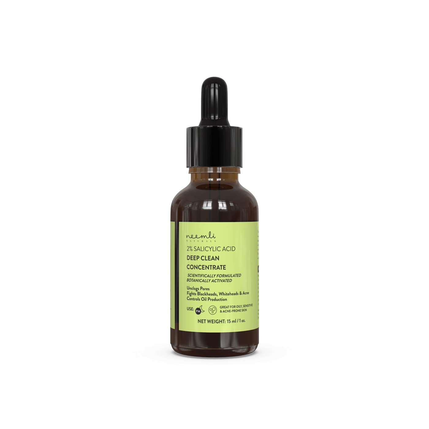 Beauty is rooted in goodness, everything we do becomes a reflection of who we are. At Neemli, we believe beauty needs no filter when everything comes from a pure, happy place.Package Contents: 1 2 Salicylic Acid Deep Clean Concentrate Face Serum, 15 ml Neemli Naturals products are formulated without synthetic ingredients, parabens, sodium lauryl sulphate, phthalates, chemicals, fillers, mineral oils, petroleum and animal based ingredients. How to Use: Use AM PM a small amount on cleansed skin at night, Start by using it as a spot treatment and build up to full face, wait for a minute or two before layering other creams or serums. This lightweight, non-sticky, daily-use concentrate is a gently effective exfoliator that clears your pore lining and decreases oil build-up to give you smoother and more even-toned skin. Improves skin texture by targeting blackheads, whiteheads, acne and excess oiliness. An effective, gentle exfoliant suspended in a unique botanical broth that penetrates pores to clean out excess sebum, oil and bacteria to prevent whiteheads, blackheads and acne while promoting faster cell regeneration.Neemli Naturals 2 Salicylic Acid Deep Clean Concentrate Face Serum Reduces Acne, Black Heads Pigmentation Unclogs Pores Suits All Skin Types, 15ml Beauty is rooted in goodness, everything we do becomes a reflection of who we are. At Neemli, we believe beauty needs no filter when everything comes from a pure, happy place.Package Contents: 1 2 Salicylic Acid Deep Clean Concentrate Face Serum, 15 ml Neemli Naturals products are formulated without synthetic ingredients, parabens, sodium lauryl sulphate, phthalates, chemicals, fillers, mineral oils, petroleum and animal based ingredients. How to Use: Use AM PM a small amount on cleansed skin at night, Start by using it as a spot treatment and build up to full face, wait for a minute or two before layering other creams or serums. This lightweight, non-sticky, daily-use concentrate is a gently effective exfoliator that clears your pore lining and decreases oil build-up to give you smoother and more even-toned skin. Improves skin texture by targeting blackheads, whiteheads, acne and excess oiliness. An effective, gentle exfoliant suspended in a unique botanical broth that penetrates pores to clean out excess sebum, oil and bacteria to prevent whiteheads, blackheads and acne while promoting faster cell regeneration.