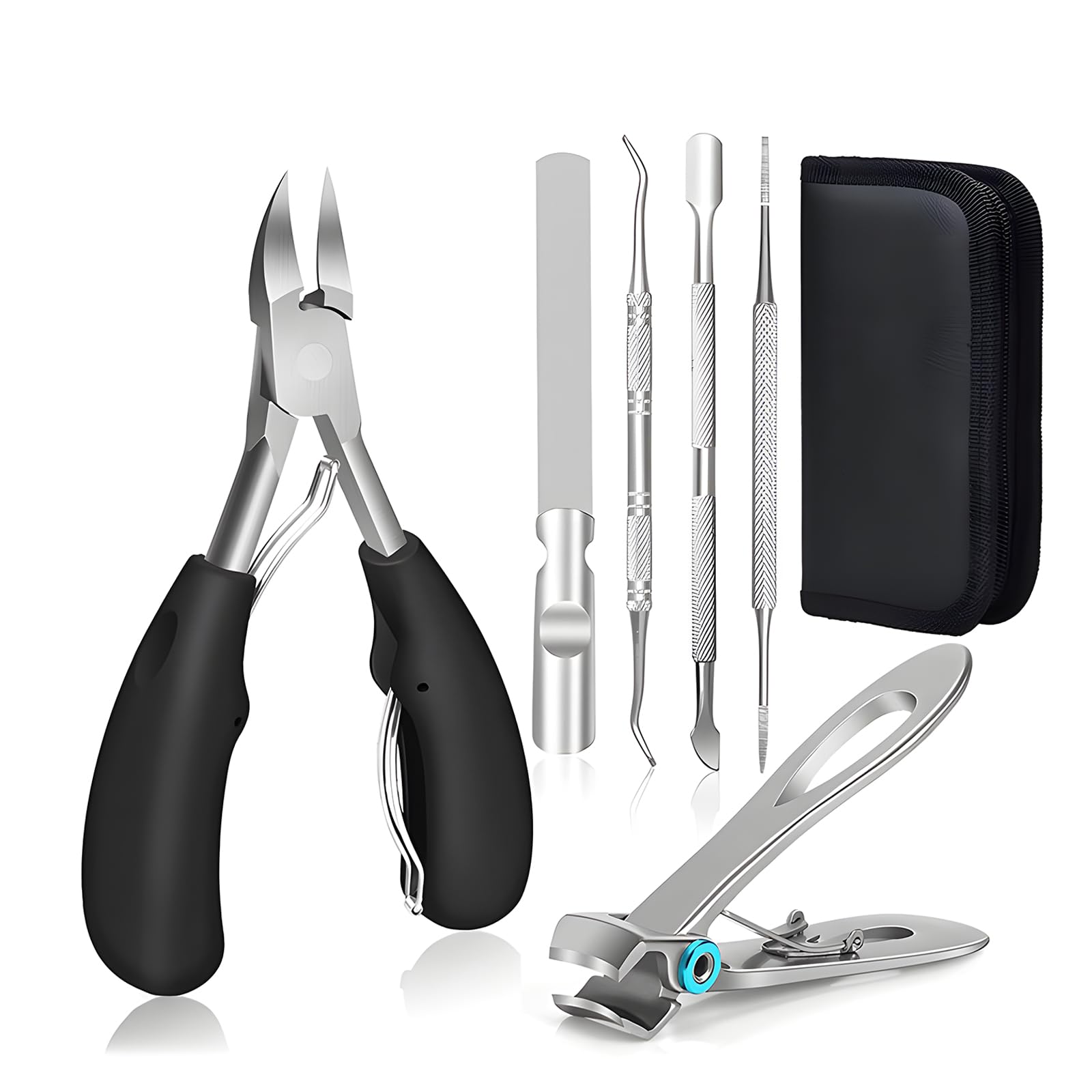 ?EASY TO USE AND CLEAN?: Ergonomically designed for comfort and precision, our toenail clippers ensure effortless trimming and are easy to clean for hygienic use. ?VERSATILE PEDICURE TOOLS?: Suitable for men, women, and seniors, our nail clippers set is perfect for home use or professional pedicures, providing professional-grade results. ?DURABLE STAINLESS STEEL CONSTRUCTION?: Made from high-quality stainless steel, these nail scissors are built to last and resist rust, ideal for long-term use. ?COMPLETE PEDICURE SET?: Includes a nail file and trimmer alongside our toenail clippers, offering comprehensive tools for maintaining healthy and groomed nails. ?EFFECTIVE TOE NAIL CLIPPERS FOR THICK NAILS?: Our toenail clippers are specially crafted to handle tough nails with ease, ensuring a clean and precise cut every time.