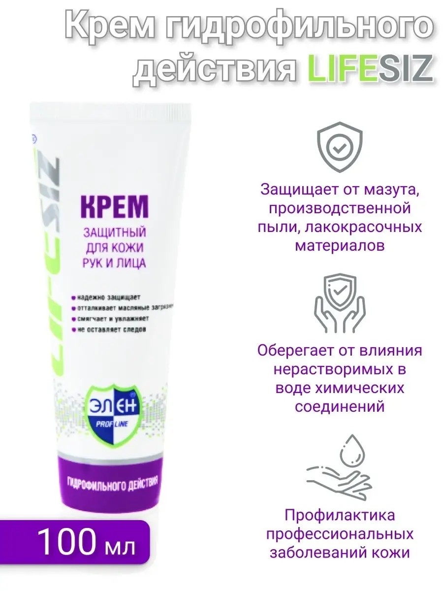 Профессиональный увлажняющий защитный гидрофильный крем "Элен" создан для защиты кожи рук и лица от воздействия водонерастворимых материалов и веществ: мазут, производственная пыль, промышленные смолы, лакокрасочные материалы, сажа, технические масла и смазки, органические растворители, нефтепродукты и сырая нефть. Профессиональный защитный крем LIFESIZ состоит из естественных сырьевых составляющих с добавлением комплекса мягких эмульгаторов. Крем способствует образованию на поверхности кожи защитного дышащего слоя, который надежно оберегает руки и лицо от влияния нерастворимых в воде химических соединений. В составе крема имеются особые компоненты, которые бережно очищают кожу от загрязнений, увлажняют, успокаивают, снимают раздражение и шелушение кожи. Крем гидрофильного действия отлично наносится, впитывается, не оставляя ощущения дискомфорта, липкости, скольжения. Крем не оставляет отпечатков на рабочих поверхностях, при всем этом он также оказывает увлажняющий эффект и смягчает кожу. Купить можно 1 шт или набор из 3 кремов.