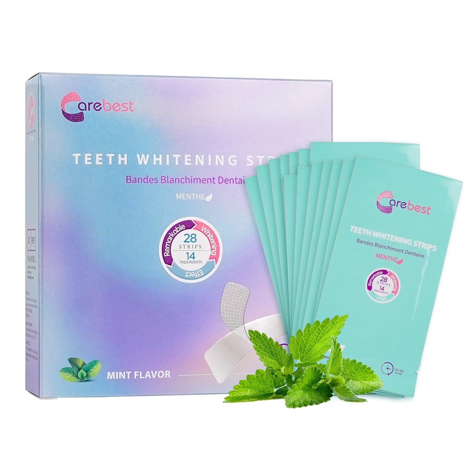 REFRESHING MINT EXPERIENCE:Enhanced with mint flavor for a pleasant whitening session, leaving your mouth feeling clean and fresh. Simple to use with detailed instructions included. CONVENIENT 14-DAY TREATMENT:Each box includes 28 strips (14 upper 14 lower) with precision fit technology for a non-slip, no-peel finish. GENTLE ON SENSITIVE TEETH: Enamel-safe whitening strips are formulated with a mild peppermint-derived formula that is comfortable to use and won't cause sensitivity. RESIDUE-FREE TECHNOLOGY:Carebest innovative gel formula adheres firmly to teeth during treatment and peels off cleanly without leaving gel residue. PROFESSIONAL-GRADE WHITENING: 6 hydrogen peroxide formula delivers visibly whiter teeth in just 14 days, removing years of tough stains from coffee, wine, and smoking.