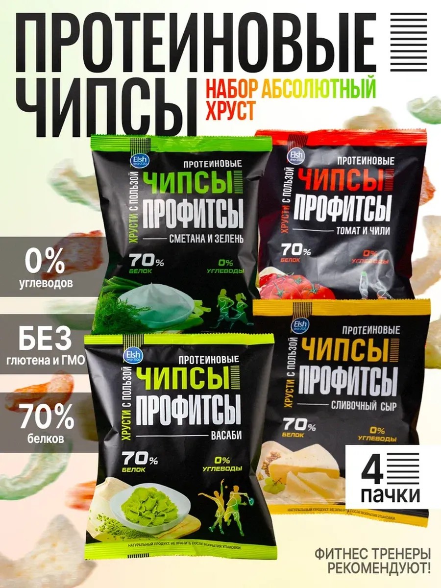 | Комплектация | Чипсы протеиновые со вкусом сыра; Чипсы протеиновые со вкусом сметаны и зелени; Чипсы протеиновые со вкусом томата и чили; Чипсы протеиновые со вкусом васаби; набор чипсов |