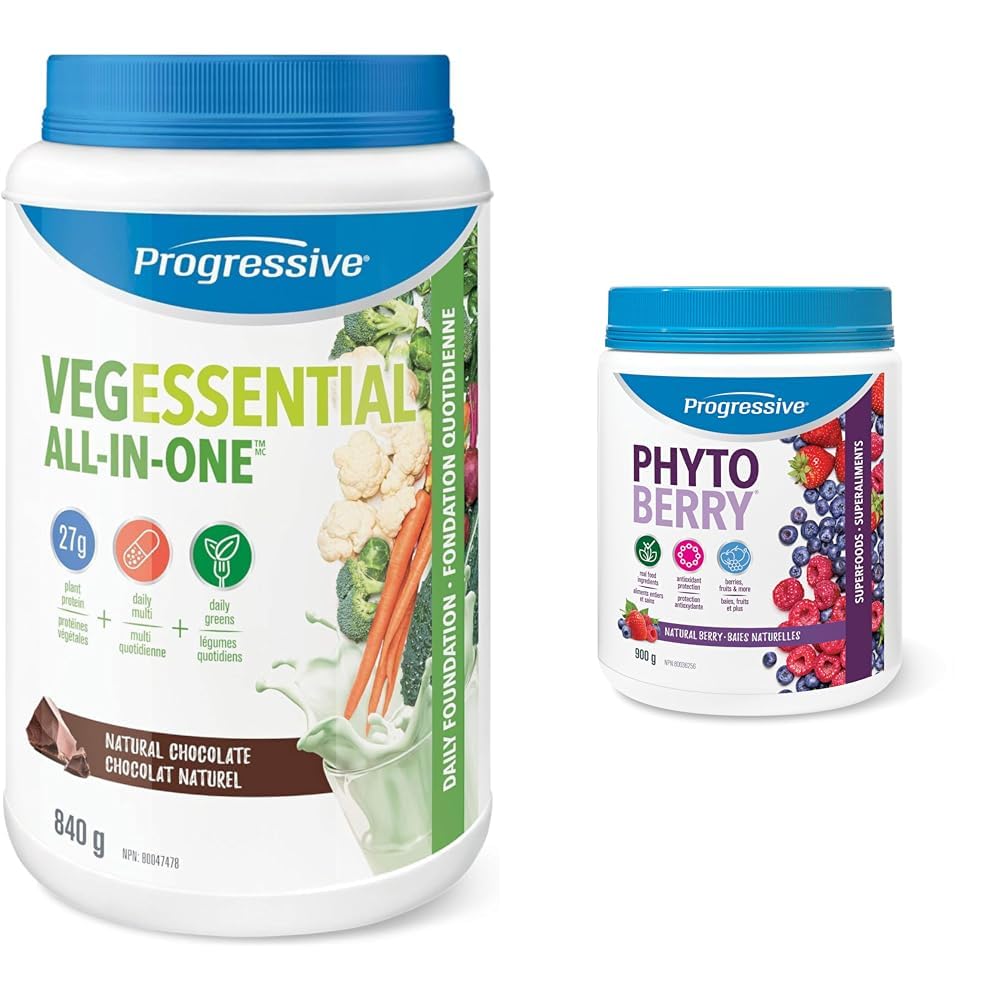 Progressive VegEssential, All-In-One Vegan Protein, Greens, Vitamins Minerals Powder - Chocolate Flavour, 840 g Progressive VegEssential is a plant-based daily foundation that provides 100 RDA of 13 vitamins and minerals in a convenient, all-in-one format. Combining nearly 100 plant-based ingredients, VegEssential provides a variety of micro and macro-nutrients including fibre, omega-3 plant oils, vitamins, minerals, and antioxidants. This plant-based formula is dairy, trans fat and cholesterol free, and contains no added sugars, artificial colours, flavours, and sweeteners. Progressive Phytoberry Supplement Powder - 900 g Antioxidant source, made with 40 fruit concentrates, phytonutrients, and plant oils Progressive PhytoBerry is a highly concentrated whole-body antioxidant supplement sourced from more than 40 fruit concentrates, phytonutrients, and plant oils. This antioxidant powder is formulated to support overall health, providing the nutrient equivalent of 6 to 8 servings of fresh fruit per scoop.Product 2: DELICIOUS: Drop a scoop in some water, mix well, and enjoy the Natural Berry flavour. Product 2: PURE, POTENT, AND PLANT-BASED: Be as close to nature as possible. Our blend is Vegan, soy-free, and gluten-free, and free from artificial flavors, colors, or sweeteners. Enjoy the trust that comes with a Canadian-made product. Product 2: WHOLE BODY DEFENSE: Each scoop is packed with a synergistic blend of antioxidants, phytonutrients and plant oils that work together to combat free radicals and support your body's daily defense. Product 2: UNLEASH THE POWER OF BERRIES: Your daily antioxidant powerhouse! Our unique blend is brimming with over 40 concentrated berry extracts and plant oils designed to nourish your whole body, promote energy production and increase mental clarity. Product 1: FIBRE-RICH FORMULA FOR DIGESTIVE HEALTH: VegEssential provides more fibre in one scoop than a whole bowl of oatmeal, with 7 grams of both soluble and insoluble fibre. This ensures your digestive system runs smoothly, supporting overall gut health. Product 1: A COMPLETE MEAL REPLACEMENT: In addition to protein, VegEssential is packed with vitamins and minerals to support overall health and executive functioning, Omega-3 plant oils for heart health, brain function, and healthy skin, and a full serving of greens, phytonutrients, and antioxidants to promote energy and reduce oxidative stress. Product 1: 27G PLANT-BASED PROTEIN PERFECTION: Each serving contains 27 grams of high-quality plant-based protein, offering more complete protein than four eggs—without relying on any animal sources. Perfect for those seeking to increase their daily protein intake and boost their fitness routine. Product 1: ALL-IN-ONE NUTRITIONAL POWERHOUSE: Meet VegEssential, your new wellness assistant- an all-in-one nutritional shake that simplifies your daily wellness routine. VegEssential uses nearly 100 plant-based ingredients to deliver a broad spectrum of vital nutrients and unmatched convenience. Get all the benefits of a cupboard full of supplements in one convenient scoop.