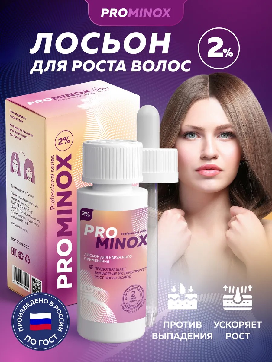 Looking for an effective product to accelerate hair, eyelash, and eyebrow growth? Then you should try Minoxidil serum from the PROMINOX line. This cosmetic product is made in Russia and is safe for health. Its innovative formula, scientifically proven to be effective, stimulates new hair growth and stops hair loss. The serum's active ingredient concentration is optimal for women at 2%. Minoxidil improves blood flow to hair follicles, promoting strong, healthy, and beautiful hair. This leave-in serum has a restorative and strengthening effect. It helps restore thickness to hair, eyebrows, and eyelashes. The nourishing formula comes in a 60 ml bottle with a tamper-evident seal. A dropper dispenser is included for convenient targeted application. This care product is suitable for both adult women and young women experiencing hair loss.
