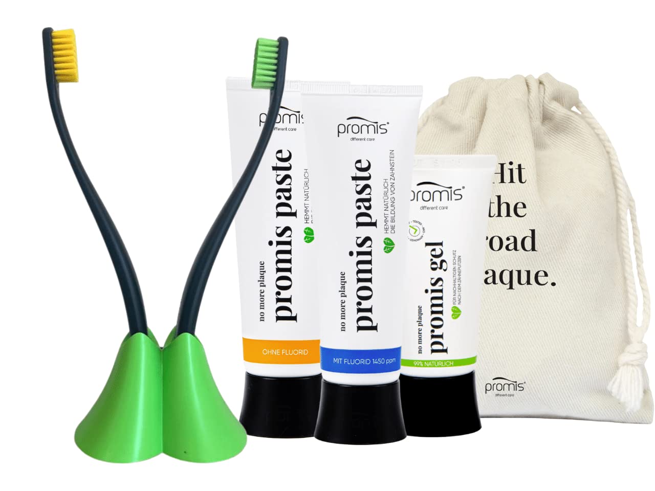 Recommended by dentists - Eliminates plastic bacteria - Naturally reduces plaque buildup - Reduces the risk of cavities - Reduces bad breath. Ingredients: Chicken meat and dental gel - 99 natural - 21 organic - Vegan. Directions: Step 1: Brush your teeth with a Promis brush and Promis toothpaste. Step 2: Apply a layer of Promis gel to your teeth using the Promis brush. Step 3: No more plaque. Italian design: These stylish and unique dental care products were created by an Italian designer. Made in Germany: Our toothbrushes and toothbrush holders are ethically made in Germany. Made in Barcelona: Our natural cosmetic toothpaste and dental gel are lovingly crafted in Barcelona. ? Tested and proven effective: Laboratory studies have shown that Promis gel prevents the formation of receptors needed to attach to the tooth in up to 70 of plaque bacteria. Without these plaque bacteria, other bacteria become more difficult to attach to the tooth. Contents: Promis toothbrush made from renewable raw materials, elegant toothbrush holder made from renewable raw materials, natural anti-plaque toothpaste, and Promis gel, the first dental gel against plaque and tartar for optimal protection after brushing.