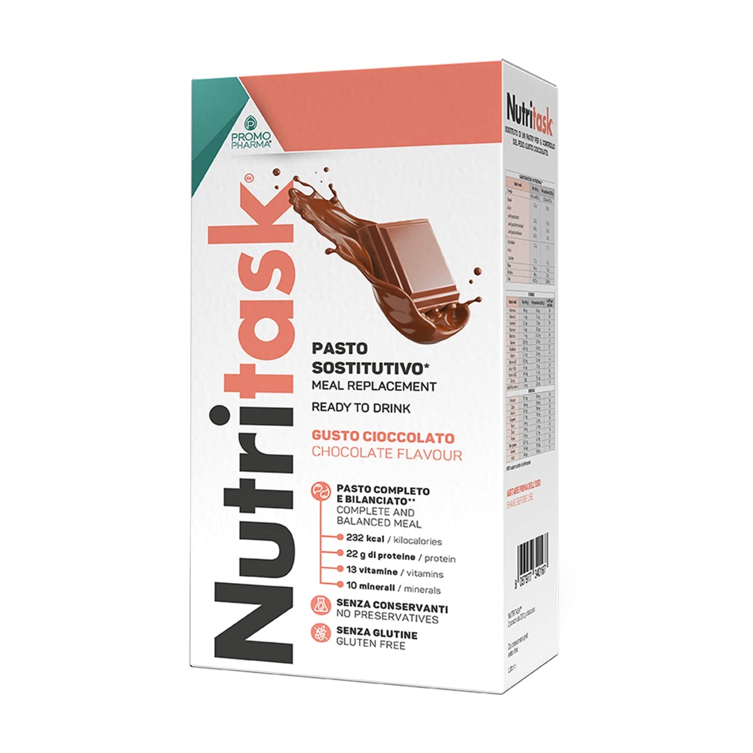 Nutritask is a complete, balanced, and ready-to-use meal replacement thanks to its resealable pouch format. It guarantees a reduced calorie intake and contains all the essential nutrients for well-being, including 13 vitamins and 10 minerals. INGREDIENTS Whole milk lactose (lactose less than 0.1 g per 100 g), milk protein 7.5 , maltodextrin, unsweetened cocoa powder, FOS (fruit oligosaccharides), modified corn starch, calcium carbonate, potassium citrate, anhydrous magnesium dicitrate, iron gluconate, zinc gluconate, copper gluconate, manganese sulfate, vitamin C (L-ascorbic acid), vitamin E, vitamin B3 acetate, niacin (nicotinamide), pantothenic acid (calcium D-pantothenate), vitamin B6 (pyridoxine hydrochloride), vitamin A (retinyl acetate), vitamin K2 (menachinone), vitamin B6 (ribox, flavin), vitamin D (cholecalciferol), vitamin B1 (thiamine hydrochloride), sodium selenite, folic acid, potassium iodide, vitamin B12 (Cyanocobalamin), Biotin (D-biotin), Thickener: Carrageenan, Stabilizer: Sodium phosphate. Sweetener: Sucralose INSTRUCTIONS FOR USE Replacing one main meal a day with Nutritask helps manage and maintain weight. One sachet is equivalent to a complete and balanced meal, with vitamins and minerals. SAFETY WARNING It is important to maintain adequate daily fluid intake and engage in regular physical activity. This product should be used as part of a balanced diet that includes other foods. For use during pregnancy, breastfeeding, and adolescence, or for use exceeding eight consecutive weeks, consult a physician. To achieve the stated effect, one main meal must be replaced daily with Nutritask . Store in a cool, dry place away from heat. Once opened, refrigerate and consume within 3 days. See moreNutritask - Repas de remplacement, complet et prêt à l'emploi - avec 13 vitamines et 10 minéraux - Sans conservateurs et sans gluten - ChocolatDESCRIPTION DU PRODUIT DESCRIPTION DU PRODUIT Nutritask est un repas de remplacement complet, équilibré et prêt à l'emploi grâce au format pouch refermable, qui garantit un apport réduit en calories et contient tous les nutriments essentiels pour le bien-être, 13 vitamines et 10 minéraux. INGRÉDIENTS Lait entier délactosate (lactose inférieur à 0,1 g pour 100 g), protéine de lait 7,5 , maltodextrine, cacao amer en poudre, FOS (fruits oligosaccharides), amidon modifié de maïs, carbonate de calcium, citrate de potassium, dicitrate de magnésium anhydre, fer gluconate, zinc gluconate de gluconate ate, cuivre gluconate , sulfate de manganèse, vitamine C (acide L-ascorbique), vitamine E acétate de vitamine B3 niacine (nicotinamide), acide pantothénique (D-pantothénate de calcium), vitamine B6 (chlorhydrate de pyridoxine), vitamine A (acétate de rétinile), vitamine K2 (menachinone), vitamine B6 2 (Ribox. Flavine), Vitamine D (Cholécalciférol), Vitamine B1 (Chlorhydrate de thiamine), Sodium Sélénite, Acide folique, Iodure de potassium, Vitamine B12 (Cyanocobalamine), Biotine (D-biotine), Épaississant : Carraghénine, Stabilisant : phosphate de sodium. Édulcorant : Sucralose MODE D'EMPLOI Le remplacement d'un repas quotidien principal par Nutritask contribue à la gestion et au maintien du poids. Une pochette équivaut à un repas complet et équilibré, avec des vitamines et des minéraux. AVERTISSEMENT DE SÉCURITÉ Il est important de maintenir un apport quotidien adéquat de liquides et de pratiquer régulièrement une activité physique. Le produit doit être utilisé dans le cadre d'un régime alimentaire qui doit nécessairement comprendre d'autres aliments. Pour une utilisation pendant la grossesse, l'allaitement et les adolescents, ou pour des utilisations supérieures à huit semaines consécutives, consultez l'avis du médecin. Pour obtenir l'effet indiqué, il est nécessaire de remplacer chaque jour un repas principal par Nutritask . Conserver dans un endroit frais et sec, à l'abri de la chaleur. Une fois ouvert, conserver au réfrigérateur et consommer dans les 3 jours. Voir plus