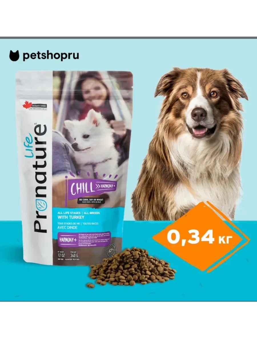 Pronature Life Chill – полнорационный сбалансированный сухой корм супер-премиум класса, специально разработанный для собак, склонных к беспокойству и/или подверженных ежедневному физическому и эмоциональному стрессу.