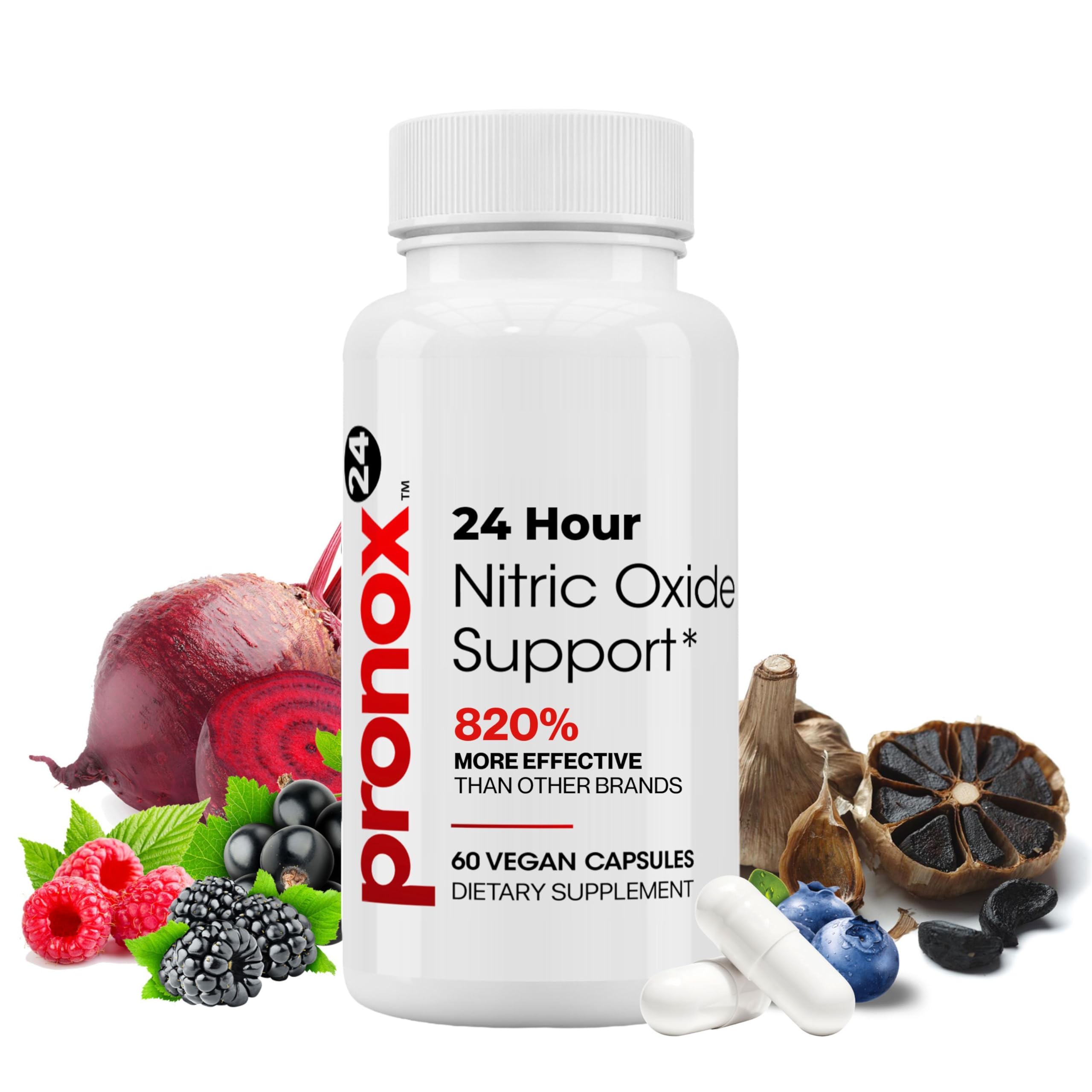TRUSTED, EFFICIENT CONVENIENT — PRONOX 24 offers a smarter way to support your cardiovascular health. Eliminate the need for multiple daily doses and feel the difference of a scientifically formulated, all-day nitric oxide solution. UNIQUE NOXA24 BLEND — Contains 700 mg of Black Garlic Extract, Beetroot Extract, Black Currant Extract, Bilberry Extract, Raspberry Extract, Blue Honeysuckle Berry Extract, and Blueberry Extract for unrivalled results. ADVANCED DUAL-ACTION FORMULA — PRONOX 24 harnesses the synergistic power of Nitric Oxide (NO) and Hydrogen Sulfide (H2S) precursors. Combined with powerful antioxidant polyphenols, this patented formula doesn't just supply ingredients—it also helps your body more efficiently produce, store, and utilize Nitric Oxide for maximum benefit. CLINICALLY PROVEN PUBLISHED RESULTS — Don't just take our word for it. In a published, IRB-approved clinical study, PRONOX 24 was shown to significantly increase Nitric Oxide levels for a full 24 hours—peaking higher and lasting longer than leading competitors. Trust in a formula validated by science. 24-HOUR NITRIC OXIDE SUPPORT FROM A SINGLE DOSE — Stop timing your supplements throughout the day. Our clinically proven formula works around the clock to keep your Nitric Oxide levels optimized, providing consistent support for your energy, circulation, and cardiovascular health from morning to night. 3.5X MORE NITRIC OXIDE THAN OTHER BRANDS — Clinically studied formula that has been proven to boost nitric oxide levels by 820 and sustain them for 24 hours with just a single dose.
