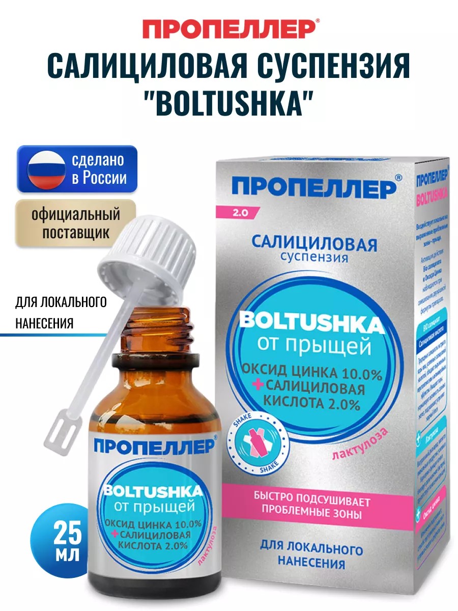 Легендарная аптечная салициловая болтушка "BOLTUSHKA" от Пропеллер для локального нанесения с улучшенным составом и в удобном формате 25 мл. Прекрасно борется с прыщами, черными точками и воспалениями.