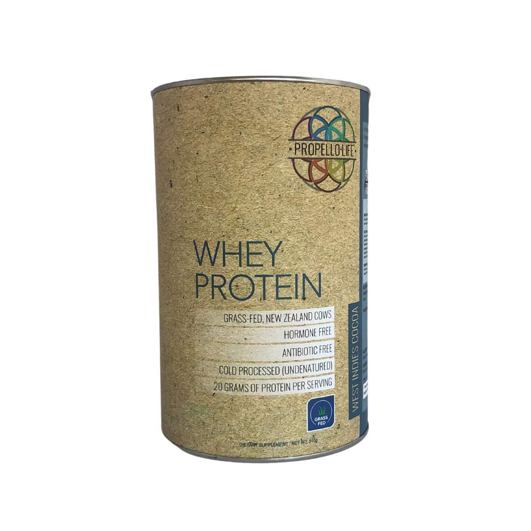 Propello Life's Whey Protein is made with the best grass-fed whey protein from New Zealand. It is non-gmo, hormone free, antibiotic free, and free of artificial ingredients. It is also cold processed - meaning the manufacturing process uses the least amount of heat as possible to preserve the protein at its most natural state - making it easier to digest and more bioavailable. The west indies cocoa flavor will have you thinking you are drinking a chocolate milkshake!