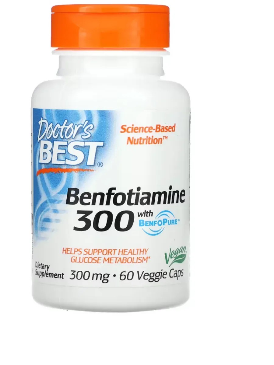 Бенфотиамин от Doctor's Best — это жирорастворимое производное тиамина (витамина B1) с высокой биодоступностью. Бенфотиамин активируется в кровотоке и поступает в организм в четыре раза дольше, чем водорастворимый тиамин. Бенфотиамин активирует транскетолазу, клеточный фермент, необходимый для метаболизма глюкозы. Он помогает поддерживать кровеносную и нервную системы, нейтрализуя радикалы и борясь с окислительным стрессом, оказывая положительное влияние на конечные продукты гликирования (AGE).