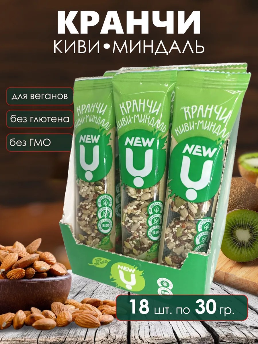 Кранчи NEW U "Киви-миндаль" – это инновационный ЗОЖ продукт – необычный порционный снек, в форме «шайбочек», который состоит из орехов, фруктов, ягод и злаков на патоке. Кранчи NEW U – это вечный двигатель тех, кто преодолевает себя на пути к своим целям и идеалам. Это крутой поворот. Новый взгляд на то, что вы едите. С минимальным содержанием сахара. Без животных жиров. Не содержит ГМО, сою, глютен, красителей и консервантов.