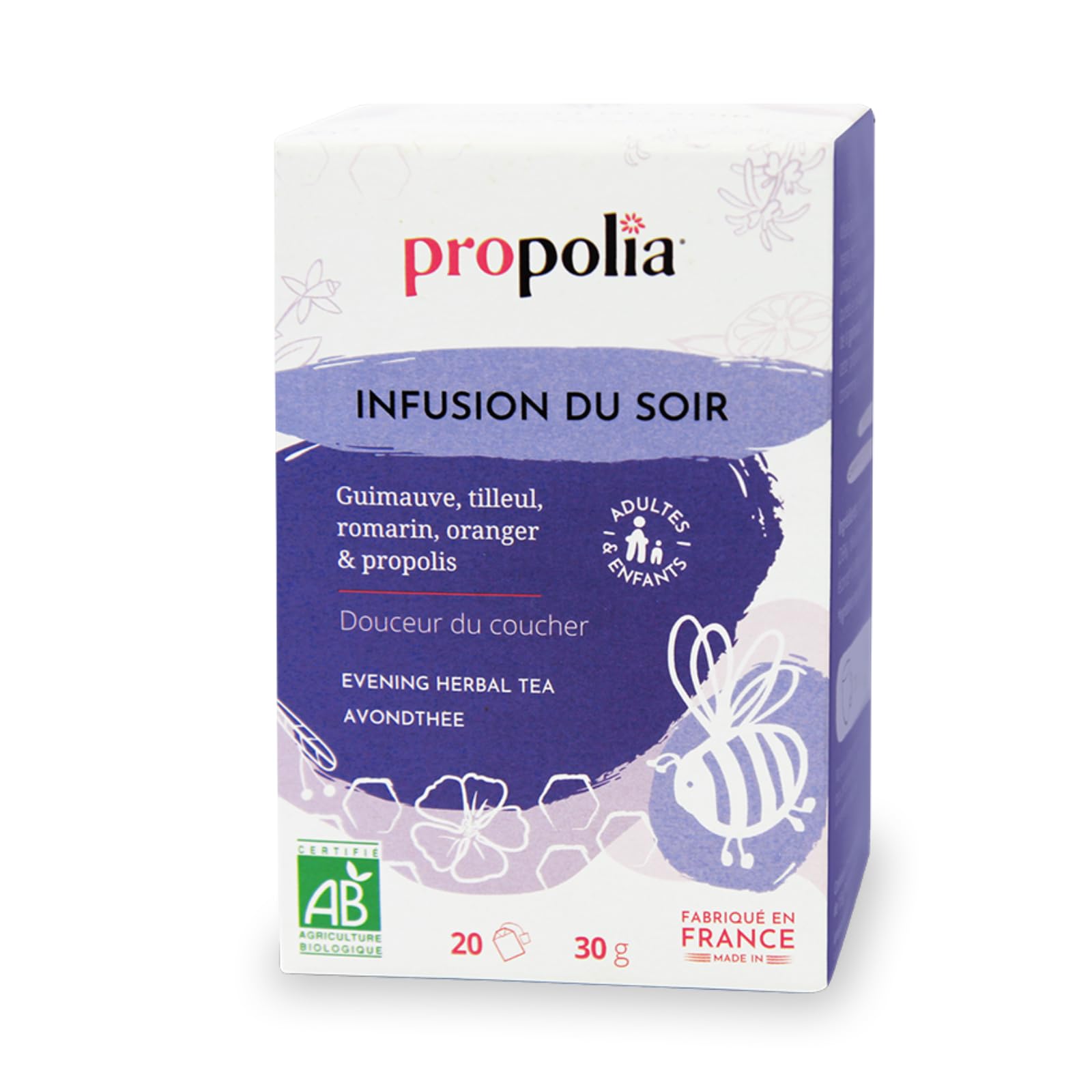 : Our busy lives and busy schedules sometimes call for a good break, especially at the end of the day. In the evening, to unwind and relax, nothing beats a soothing herbal infusion with a pleasant aroma to promote healthy and restorative sleep. You'll be captivated by the light touch of orange and linden in this herbal tea. The plants selected for this infusion will guide you towards gentle relaxation. The combination of marshmallow root, linden flower, rosemary leaf, and sweet orange peel has been developed for you by Propolia . These delicately scented plants, combined with propolis extract, allow you to rediscover all the benefits of this treasure from the hive in a warm, captivating, and relaxing beverage. Enjoy the natural qualities of the plants and propolis with this infusion that will provide you with a gentle feeling of relaxation. Prepare your Propolia organic evening infusion as often as you like. Drink it right after dinner or before bed to benefit from its relaxing effect. Let it steep for 8 to 10 minutes. Product details: Relaxing infusion of linden rosemary orange blossom marshmallow propolis. Ideal for optimal relaxation. Box of 20 freshness bags of 1.5g each. Suitable for vegetarians. Made in France. PROPOLIA. About Propolia : The brand was born from the passion of a beekeeper. It all began in 1975 when Marc-Alain Bernard settled in the Hérault region to cultivate his passion. Curious, he studied the properties of propolis, and in 1979, the Propolia brand was created, along with the famous Propolis Gum . Today, Propolia offers a range of cosmetics and food supplements made from beehive products. Propolia offers you all the treasures of apitherapy thanks to rigorously and carefully selected ingredients. INCI List: Plants (Marshmallow leaf , Linden flower , Sweet Orange peel and Rosemary leaf ) 93.5 , Propolis extract 6.5 . ingredients from organic farming. Ingredients: Plants (Marshmallow leaf , Linden flower , Sweet Orange peel and Rosemary leaf ) 93.5 , Propolis extract 6.5 . Instructions: Place the sachet in a cup of hot water and let it steep for 8 to 10 minutes. Enjoy this infusion mixed with mild honey. Do not exceed the recommended daily dose. This product is not a substitute for a varied and balanced diet and a healthy lifestyle. Safety Warning: Contraindicated for people allergic to bee products. store away from heat and humidity. Do not exceed the recommended daily dose. This product is not a substitute for a varied and balanced diet and a healthy lifestyle. See more