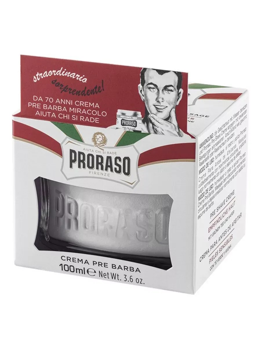 Proraso Sensitive Green Tea Pre-Shave Cream is a cream for sensitive skin with tea tree, thyme, and oat oils. It softens stubble, allowing the razor to glide smoothly without excessive resistance. Directions: Wet your beard with warm water, massage the cream in, and let it soak in for one to two minutes. Apply shaving foam and begin shaving. The cream can be used both before and after shaving.