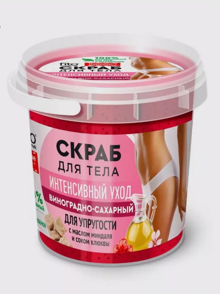 Folk Recipes Grape-Sugar Body Scrub, 150 ml (1 pc.) This delightful scrub, made with cane sugar and ground grape seeds, gently cleanses the skin, leaving it incredibly supple, soft, and supple. Almond oil and cranberry juice effectively nourish the skin, providing a long-lasting feeling of hydration and comfort.