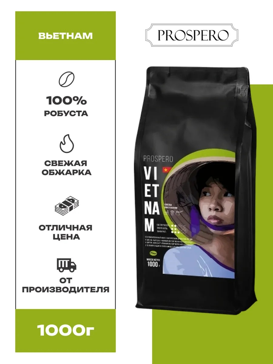 Кофе в зернах Prospero Вьетнам - это отличный выбор для настоящих ценителей кофе. Упаковка весом 1 кг предлагает вам возможность насладиться качественным напитком, изготовленным из 100% робусты, обладающего характерным насыщенным вкусом и ароматом.