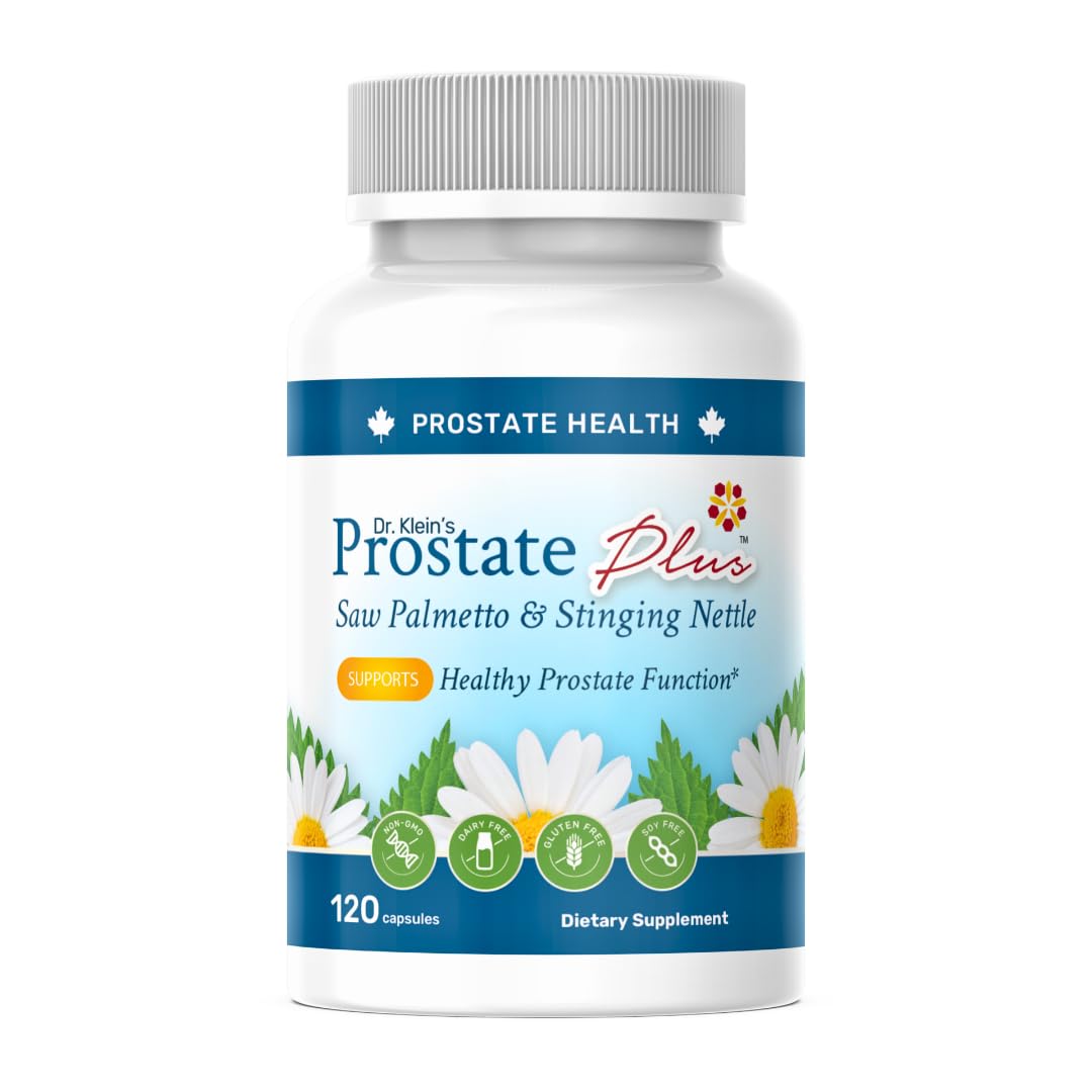 Dr. Klein's Prostate Plus Supplement for Men is formulated for prostate health without the discomfort of frequent night time and daytime urination. Whether you're experiencing the effects of aging or want to give attention to prostate function, this supplement is an essential addition to your daily routine. Our prostate health supplement combines Saw Palmetto for Men, Stinging Nettle Root Extract, and Chamomile to provide a comprehensive answer for common prostate issues. Saw Palmetto has long been used in regards to prostate health, inflammation, and healthy urinary flow. Stinging Nettle Root, found in stinging nettle capsules, works with symptoms like weak urine flow and frequent trips to the bathroom that could cause interruptions. Additionally, Stinging Nettle Leaf balances hormones that affect prostate health, making it a key ingredient in this supplement. Dr. Klein's Prostate Plus is designed for men who suffer from night time urination or those who find themselves frequently needing to visit the bathroom during the day. By targeting bladder emptying, our prostate supplement rids the need for constant trips to the restroom. Incorporating chamomile into the formula provides benefits to rid discomfort in the urinary system. The combination of Saw Palmetto for Men and Stinging Nettle Root Extract works synergistically for prostate health while targeting urinary symptoms. Each bottle of Dr. Klein's Prostate Plus contains 120 easy-to-swallow capsules, offering a full month's supply of prostate supplements. With its blend of Saw Palmetto for Men, Stinging Nettle Root, and Chamomile, Dr. Klein's Prostate Plus is the choice for men looking for prostate health capsules without urinary discomfort. Experience overall wellness in urinary function and prostate health with this all-in-one supplement. Try Dr. Klein's Prostate Plus and live without the constant interruptions of bathroom breaks!
