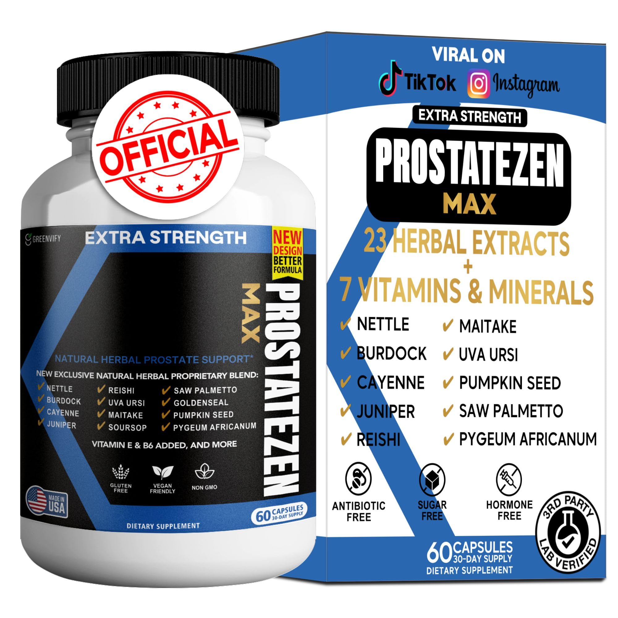 GreenVify ProstateZen Max is a powerful, extra-strength herbal formula designed to provide maximum support for prostate health. Each serving contains a potent blend of natural ingredients, including Saw Palmetto, Pygeum, Nettle, and Reishi mushrooms to promote healthy prostate function. Our supplement is carefully crafted to offer targeted support for men's health while being completely vegan and gluten-free. Key Benefits: Herbal Formula: Packed with time-tested herbs like Saw Palmetto and Pygeum, known for supporting prostate function. Vitamins Minerals: Includes essential nutrients such as Vitamin E, Vitamin B6, Zinc, Selenium, and Copper. Gluten-Free Vegan: Suitable for those following gluten-free and vegan lifestyles. Supports Overall Wellness: With ingredients like Maitake and Soursop, this supplement provides holistic wellness benefits beyond prostate support. Suggested Use: As a dietary supplement, take two (2) veggie capsules once a day. For best results, take 20-30 minutes before a meal with an 8 fl oz. glass of water or as directed by your healthcare professional. Caution: Do not exceed recommended dose. Pregnant or nursing mothers, children under the age of 18, and individuals with a known medical condition should consult a physician before using this or any dietary supplement. Keep out of reach of children. Do not use if safety seal is damaged or missing. Store in a cool, dry place. These statements have not been evaluated by the Food and Drug Administration. This product is not intended to diagnose, treat, cure, or prevent any disease.Made in the USA: Manufactured in the USA under strict quality control, ensuring you receive the highest quality herbal supplement available. Packed with Vitamins Minerals: Enriched with essential vitamins Vitamin E and Vitamin B6, along with Zinc, Selenium, and Copper to support overall health. Vegan Gluten-Free: Enjoy the benefits of a vegan-friendly, gluten-free supplement made with natural ingredients, free from harmful additives. Natural Prostate Support: Formulated with powerful herbs including Saw Palmetto and Pygeum, known for their support of prostate health and function. Extra Strength Formula: GreenVify ProstateZen Max offers an extra-strength herbal blend designed to support prostate health with Saw Palmetto, Pygeum, Nettle, Maitake, and more.