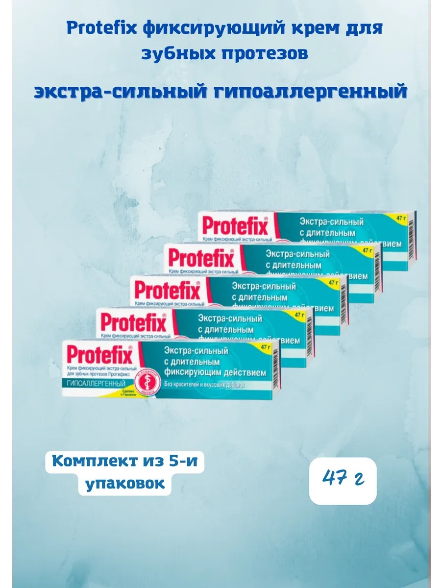 Применять только при здоровой слизистой оболочке полости рта! В течение 5 минут после нанесения не следует принимать пищу. Пользуйтесь гипоаллергенным экстра-сильным фиксирующим кремом Protefix очень экономно, так как передозировка снижает удерживающую способность крема.