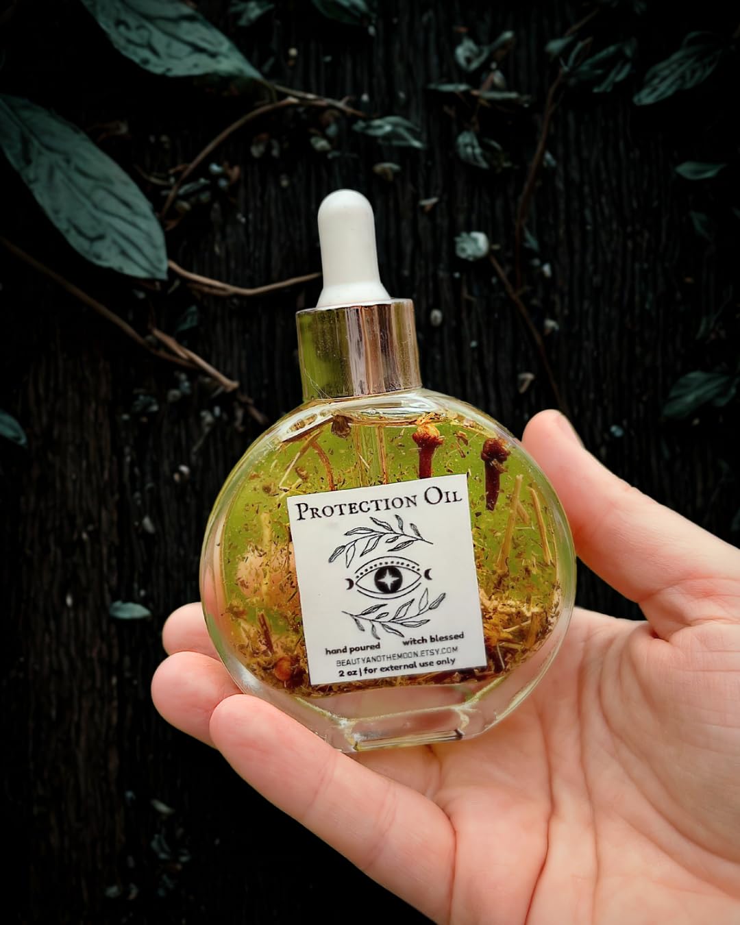 Infused with Intention Non-Toxic Eco-Friendly Woman Made Hand Poured Made in the USA Harness centuries-old folk-magic traditions with this potent Protection Oil, housed in a modern sleek 2 oz round glass bottle topped with a rose gold and white dropper. Blended with organic carrier oil and powerful essential oils such as frankincense, cedarwood, clove, and peppermint for protective and cleansing purposes, this formula creates a multi-layered energetic barrier against negativity, the evil eye, and unwanted influences. Key Uses: Spellwork Rituals: Anoint your protective talismans, candles, doorways, or ritual tools to strengthen warding intentions. Body Oil: Massage onto wrists, temples, the back of the neck, or the soles of your feet to carry a personal shield of protection everywhere you go. Bath Oil: Add 10-15 drops to your bathwater for a purifying soak that cleanses both body and aura. Perfume: Wear as a subtle, grounding fragrance that reminds you of your own inherent strength and safety. Why It Works: Frankincense cleanses and elevates the spirit, clearing away low-vibrational energy. Cedarwood offers ancient forest protection, promoting stability and courage. Clove acts as a powerful barrier, sealing out negativity and malevolent intent. Peppermint sharpens the mind and refreshes the aura, deflecting psychic intrusion. Traditional Protective Herbs (such as devil's shoestring, agrimony, and wormwood) have been used for centuries to ward off evil and fortify personal boundaries. Pure Ethical: Crafted in the USA with 100 organic carrier oil and therapeutic-grade essential oils Non-toxic, cruelty-free, and eco-friendly Small Business and Woman Owned, Blessed By a Practicing Witch Empower your practice and daily life with this all-purpose Protection Oil. This anointing, spell, and bath oil is what you need to create a sacred space, reinforce your energetic armor, and carry the confidence of ancient guardians wherever you go.Beautiful Rose Gold and White Dropper. 2oz Eco-Friendly Elegant Glass Bottle. Small, Woman Owned Business. Traditional Natural Herbs Added For Intention. 100 Pure Essential Oils Added. Natural Almond and Jojoba Oil.