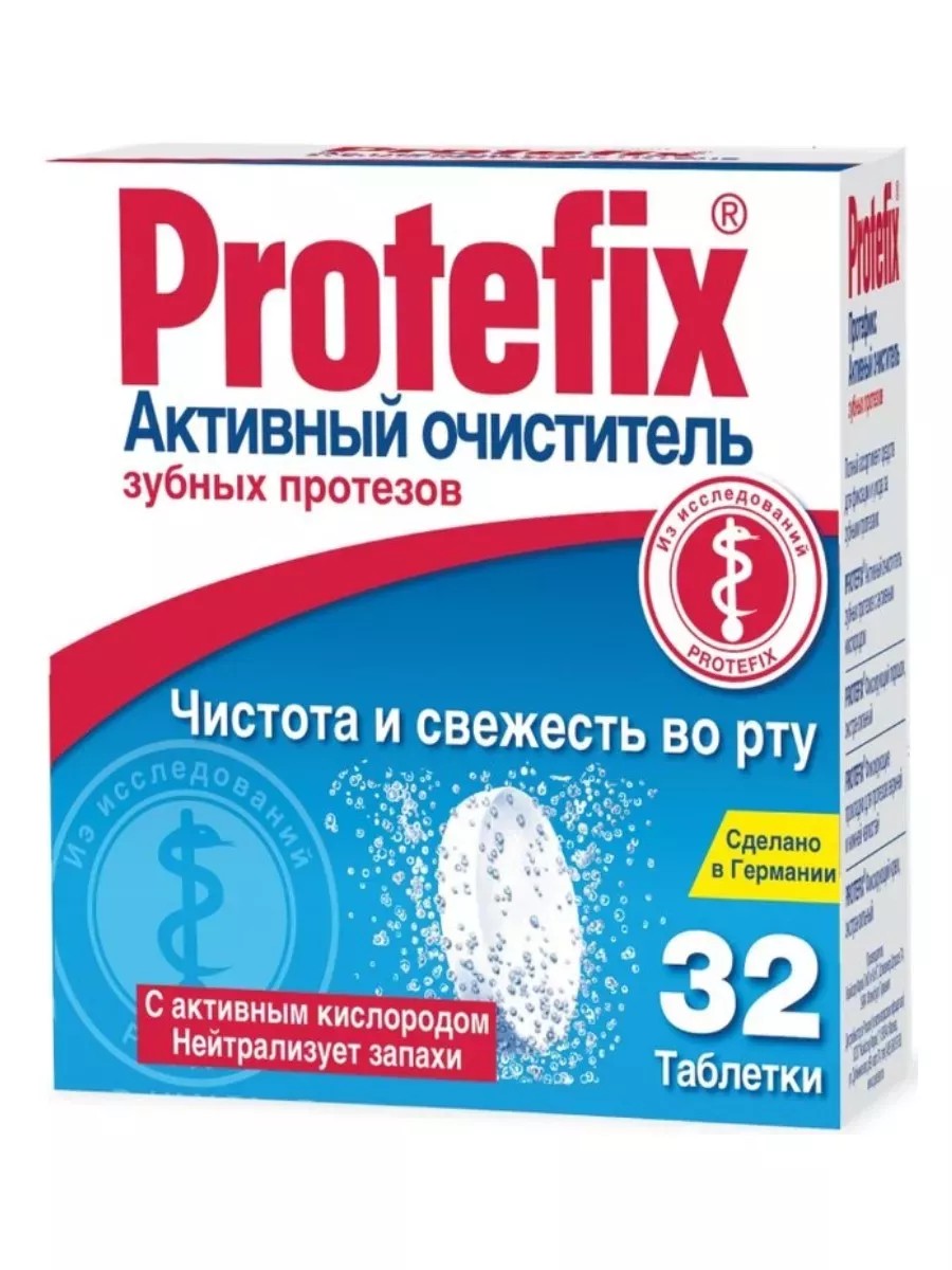 Protefix активный очиститель зубных протезов, в удобном формате таблеток, предназначен для быстрой и эффективной очистки поверхности протезов. Одной только чистки протезов зубной щеткой недостаточно, необходимы специальные средства для ежедневного ухода за зубными протезами. Особенно хорошо в качестве таких средств зарекомендовали себя таблетки. Они содержат активный кислород, очищают протезы, уничтожают запахи, не разрушая при этом ценный материал, из которого изготовлены протезы, надолго сохраняют свежий запах во рту. Удобная упаковка в виде таблеток позволяет легко брать с собой в дорогу или на работу, а также дозировать необходимое количество средства для очистки протезов. Сделайте уход за своими зубными протезами еще проще и удобнее с Protefix активным очистителем.